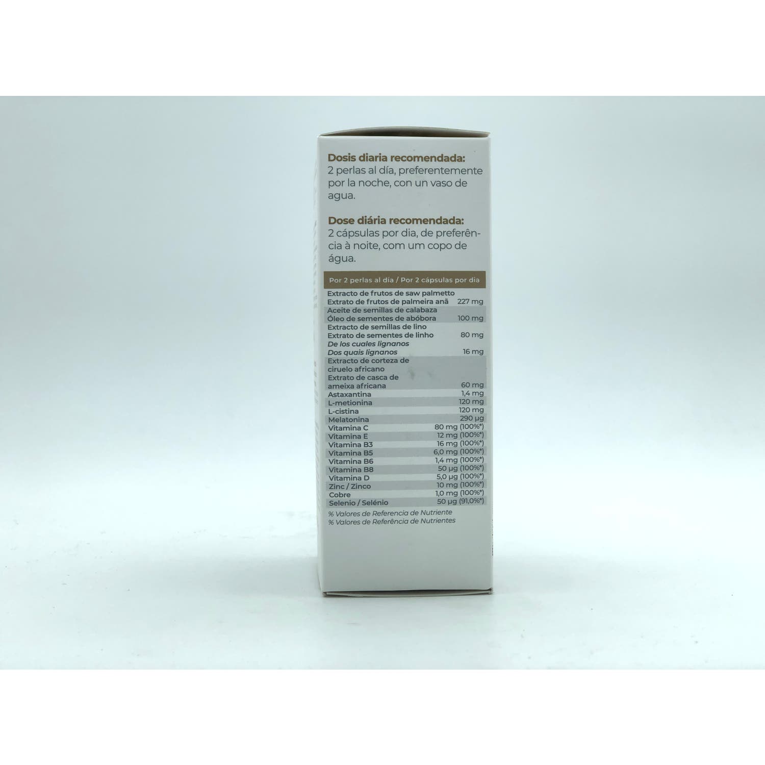 Análisis nutricional para 2 cápsulas: Extracto de saw palmetto: 320 mg Extracto de semillas de calabaza: 100 mg Extracto de semillas de lino: 80 mg del cual lignanos: 16 mg Extracto de pygeum africanum: 60 mg L-metionina: 120 mg L-cistina: 120 mg Vitamina C: 80,0 mg (100%*) Vitamina E: 12,0 mg (100%*) Vitamina B3: 16,0 mg (100%*) Vitamina B5: 6,0 mg (100%*) Vitamina B6: 1,4 mg (100%*) Vitamina B8: 50,0 µg (100%*) Vitamina D: 5,0 µg (100%*) Silicio: 24,0 mg Zinc: 10,0 mg (100%*) Cobre: 1,0 mg (100%*) Selenio: 50,0 µg (91%*) AstaReal®: 14 mg del cual astaxantina: 1,4 mg Melatonina: 0,3 mg.