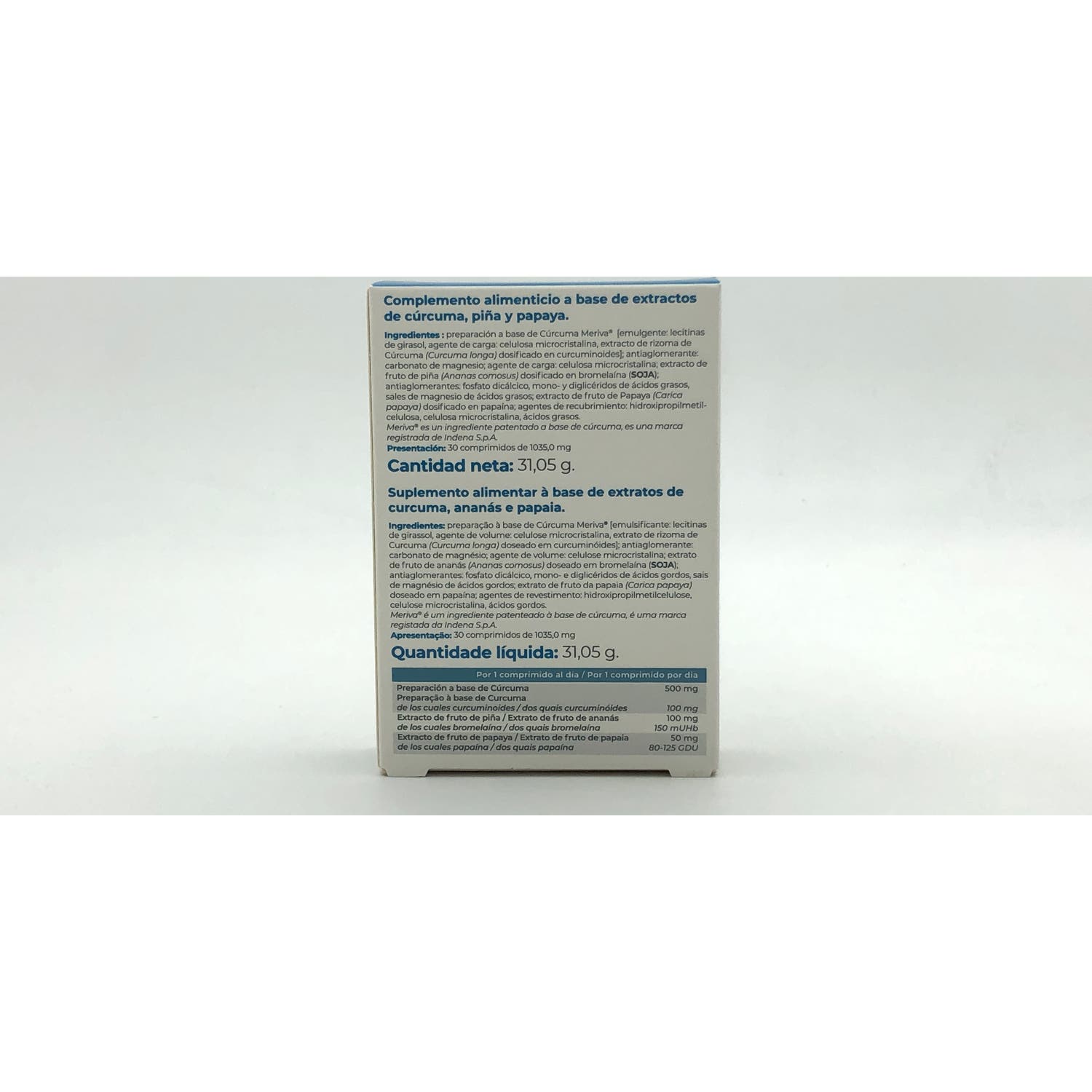 Preparación a base de Cúrcuma* [emulsionante: lecitinas de soja, agente de carga: celulosa microcristalina, extracto de rizoma de Cúrcuma (Curcuma longa) (dosificado en curcuminoides)]; antiaglomerante: carbonato de magnesio; agente de carga: celulosa microcristalina; extracto de fruta de piña (Ananas comosus) (dosificado en bromelaína) (soja); antiaglomerantes: fosfato dicálcico, mono-, di- y triglicéridos de ácidos grasos, estearato de magnesio; extracto de fruta de Papaya (Carica papaya) (dosificado en papaína); agentes de recubrimiento: hidroxipropilmetilcelulosa, celulosa microcristalina, ácidos grasos.