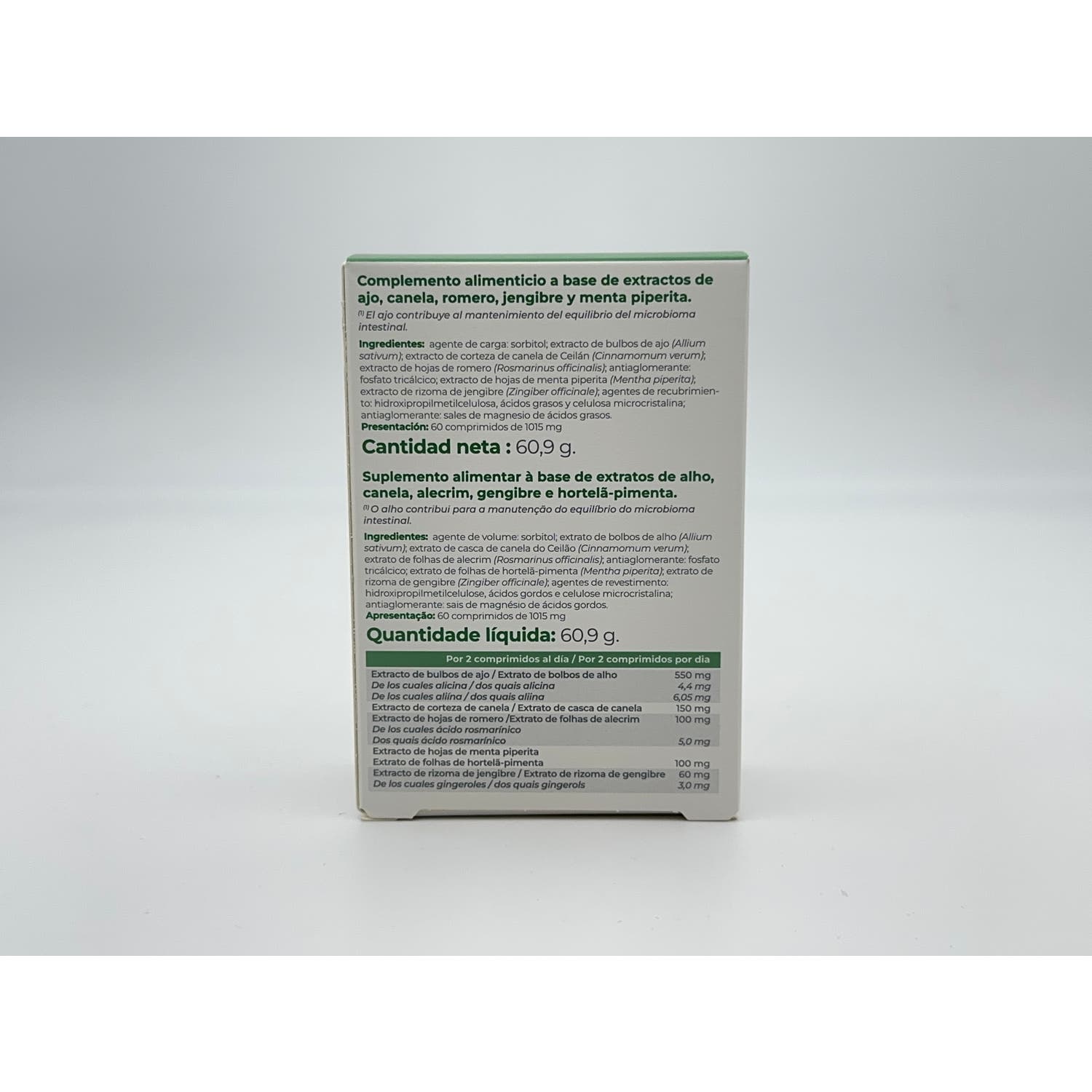 La composición contiene: Extracto seco de bulbos de ajo, extracto seco de corteza de canela, hojas de romero, raíces de jengibre y hojas de menta.