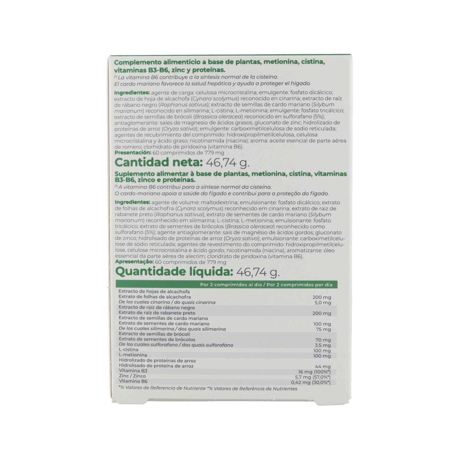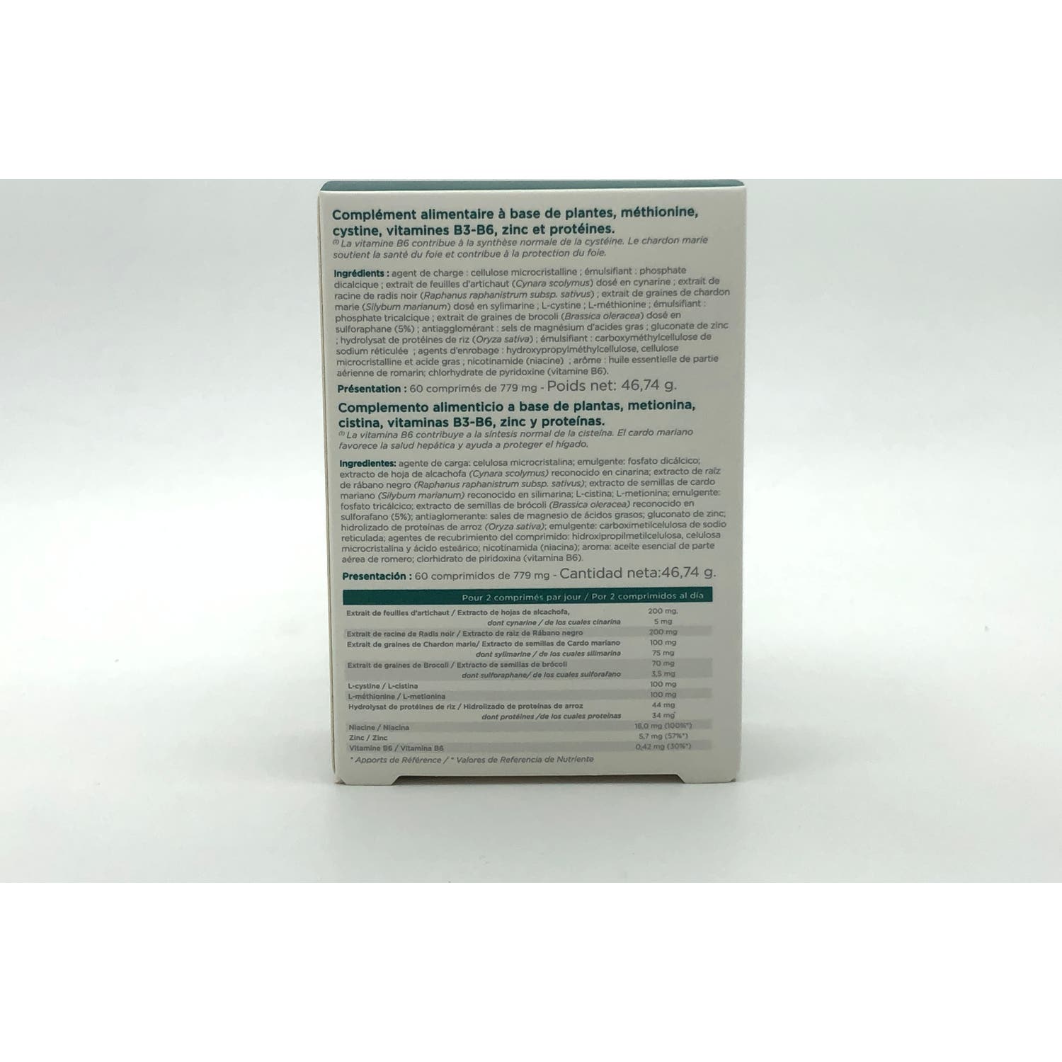 agentes de carga [maltodextrina, celulosa microcristalina]; extracto de alcachofa (Cynara scolymus) dosificado en cinarina; extracto de rábano negro (Raphanus sativus); agente de carga [fosfato dicálcico]; colorante [clorofila]; extracto de semillas de cardo mariano (Silybum marianum) dosificado en silimarina; brócoli en polvo (Brassica oleracea) [jarabe de glucosa, almidón de maíz, emulgente: lecitina de girasol]; agente de carga [fosfato tricálcico]; L-cistina; L-metionina; antiaglomerante [estearato de magnesio]; gluconato de zinc; hidrolizado de proteínas de arroz (Oryza sativa); recubrimiento del comprimido [hidroxipropilmetilcelulosa, celulosa microcristalina, ácido esteárico]; croscarmelosa de sodio; agente de carga [fosfato dicálcico]; aroma [aceite esencial de romero]; nicotinamida (vitamina B3); clorhidrato de piridoxina (vitamina B6).