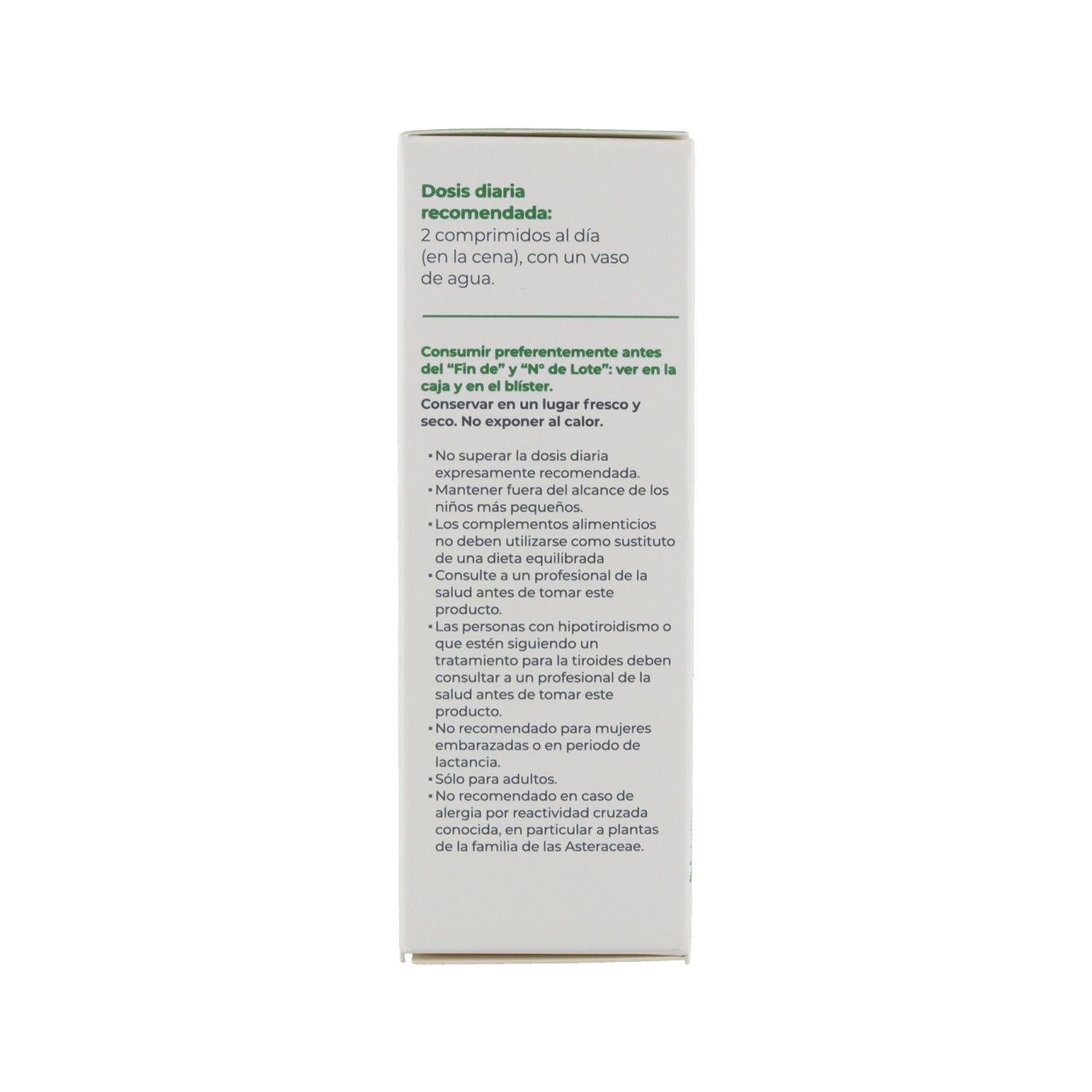 Tomar 2 comprimidos diarios con la cena. Los complementos alimenticios deben tomarse dentro de una dieta variada y equilibrada y como parte de un estilo de vida activo.