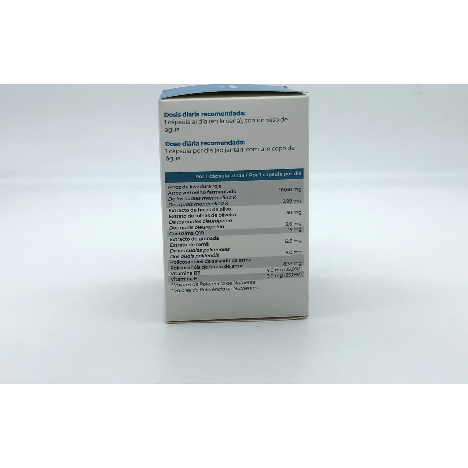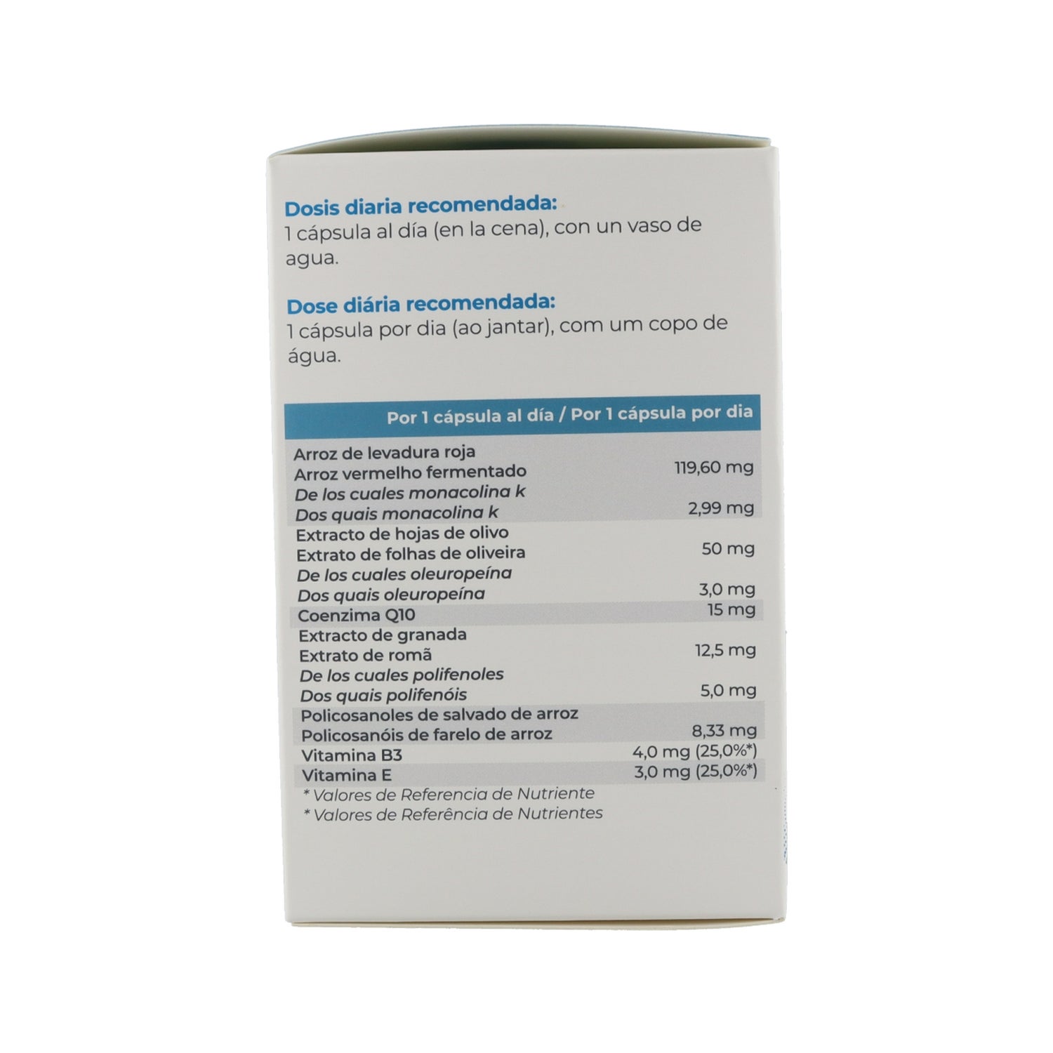 Su fórmula contiene monacolina K de levadura roja de arroz, que favorece el mantenimiento de una colesterolemia normal. Los extractos de fruto de olivo, de granada y la vitamina E actúan como antioxidantes y ayudan a proteger las arterias inhibiendo la formación de riesgos para la salud cardiovascular.