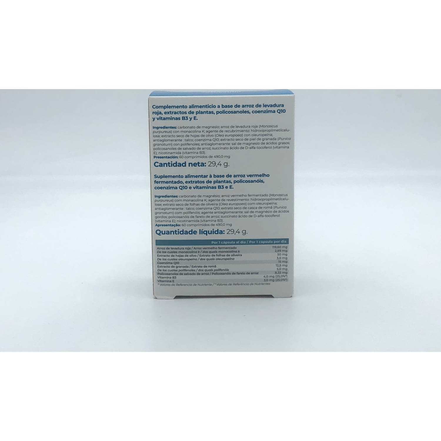 Su fórmula contiene monacolina K de levadura roja de arroz, que favorece el mantenimiento de una colesterolemia normal.Los extractos de fruto de olivo, de granada y la vitamina E actúan como antioxidantes y ayudan a proteger las arterias inhibiendo la formación de riesgos para la salud cardiovascular.