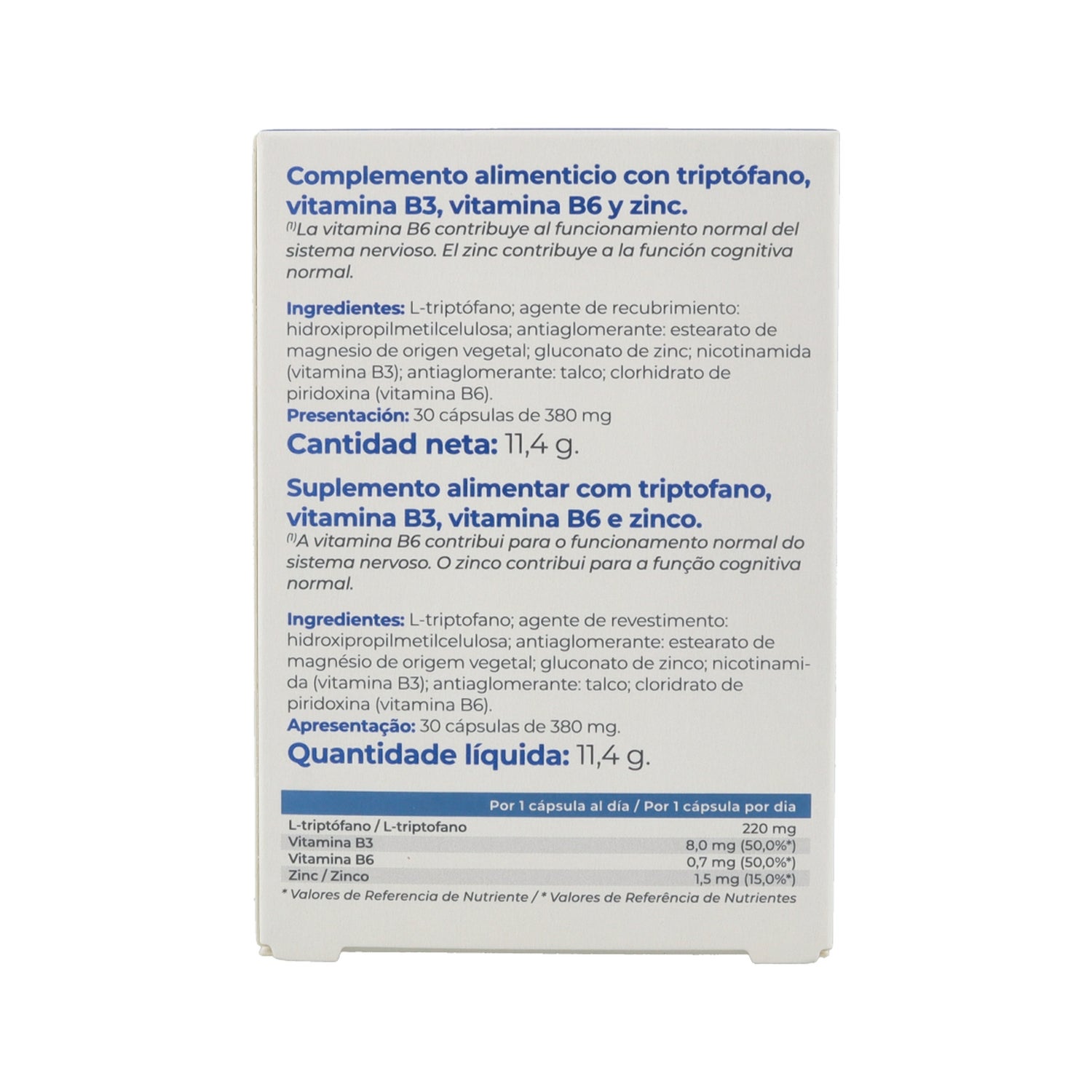 Inovance Serotone 30caps es un complemento alimenticio a base de triptófano, vitaminas B3-B6 y zinc.