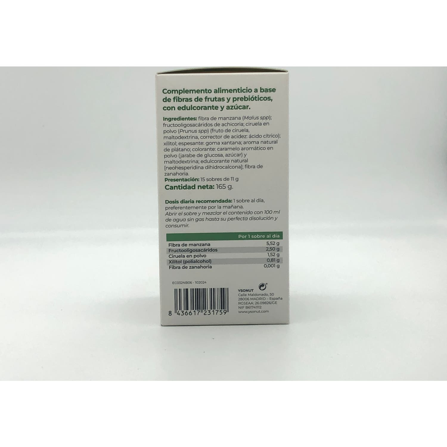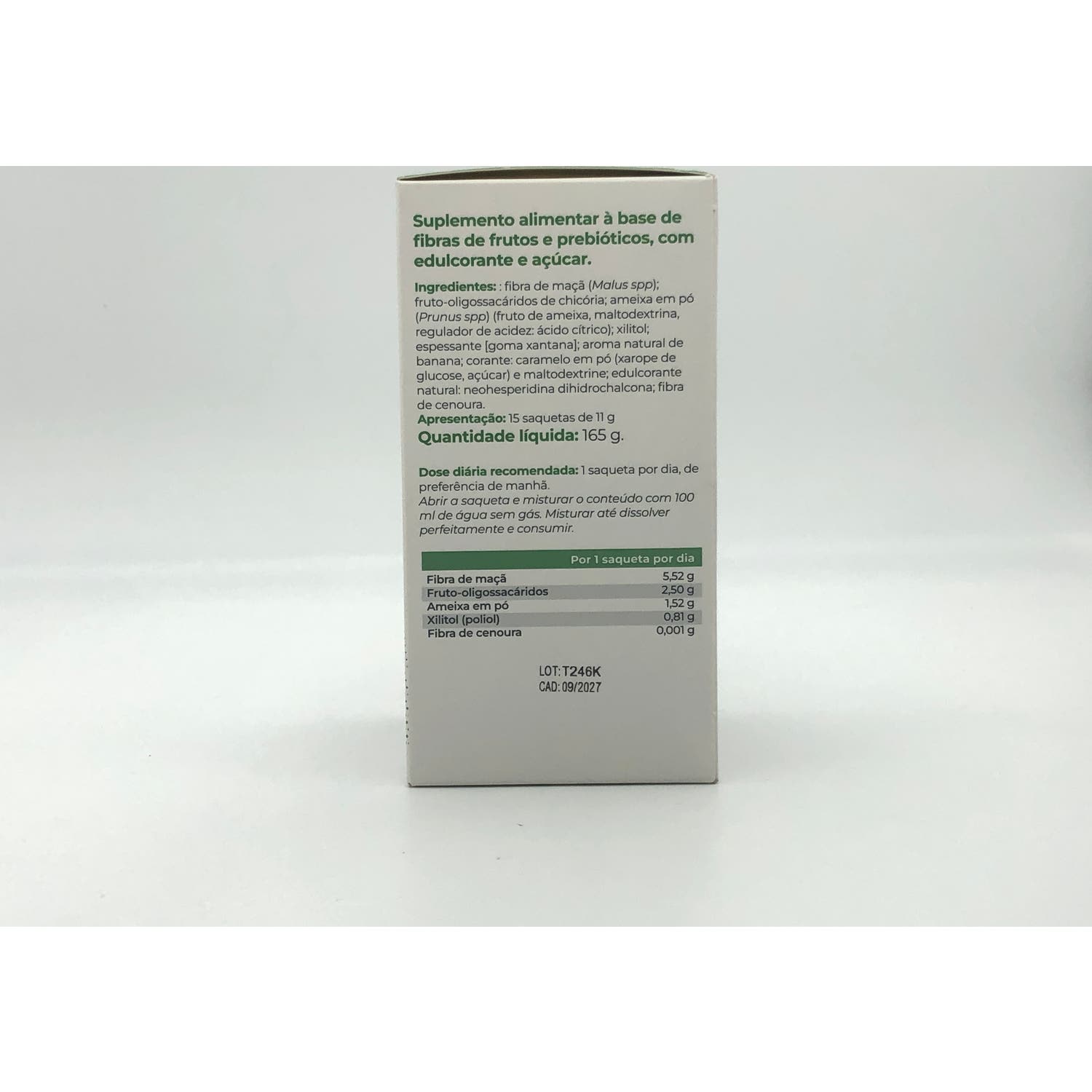 Formulado a base de fibra de frutas y prebióticos. Un total de 9,5 g de fibra, es decir, 1/3 de la ingesta diaria recomendada de fibra: la fibra de manzana y de ciruela pasa son ricas en celulosa y hemicelulosa. La fibra de achicoria tiene un efecto prebiótico sobre la flora intestinal.