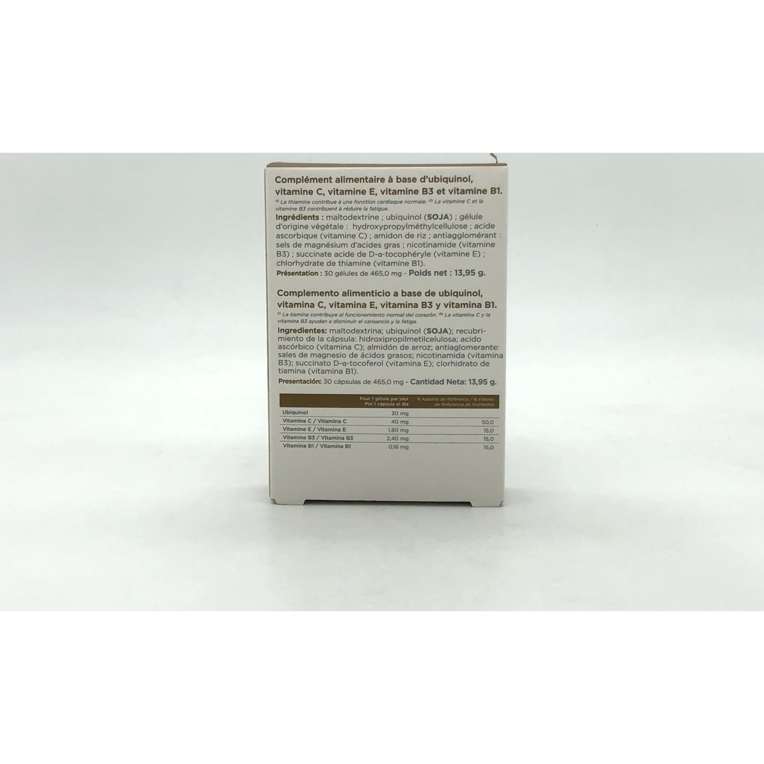 Maltodextrina, Ubiquinol P30TM microencapsulado (Soja), Recubrimiento de la cápsula (Hidroxipropilmetilcelulosa), Vitamina C, Almidón de arroz, Antiaglomerante (Estearato de Magnesio de origen vegetal), Succinato D-α-tocoferol (Vitamina E de origen natural), Nicotinamida (vitamina B3), Tiamina (vitamina B1).