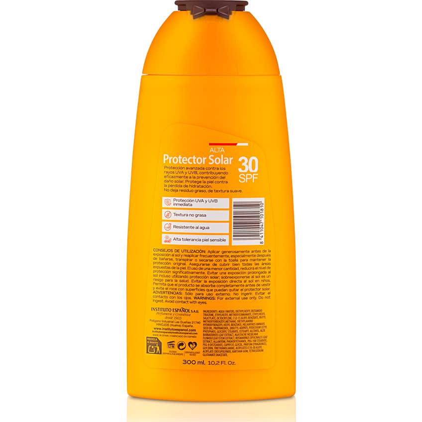 Instituto Español Protector Solar Aloe Vera Spf30 Loción 300ml es un protector solar de alta calidad que ofrece una protección eficaz e inmediata contra los rayos UVA y UVB. Este producto se presenta en un formato de loción de 300 ml, ideal para un uso prolongado.