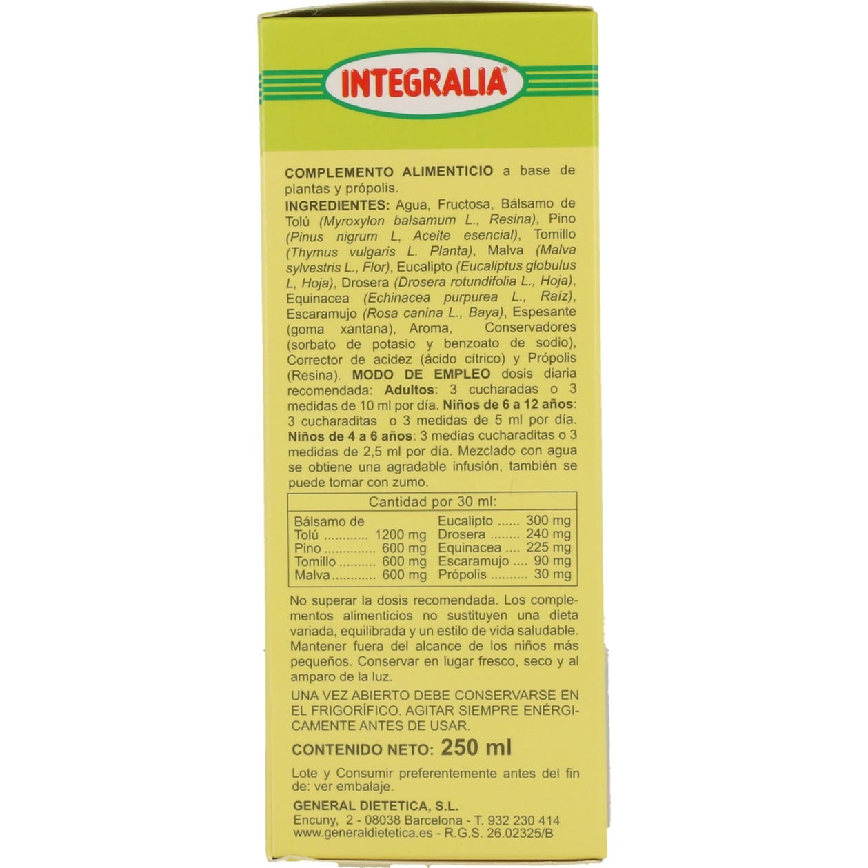 Por 1 dosis: Bálsamo de Tolú (Myroxylon balsamum L., Resina) 1200 mg, Pino (Pinus nigrum L., Aceite esencial) 600 mg, Tomillo (Thymus vulgaris L., Sumidad florida) 600 mg, Malva (Malva sylvestris L., Flor) 600 mg, Eucalipto (Eucalyptus globulus Labill., Hoja) 300 mg, Drosera (Drosera rotundifolia L., Hoja) 240 mg, Equinácea (Echinacea purpurea Moench, Raíz) 225 mg, Escaramujo (Rosa canina L., Fruto) 90 mg, Própolis 30 mg.