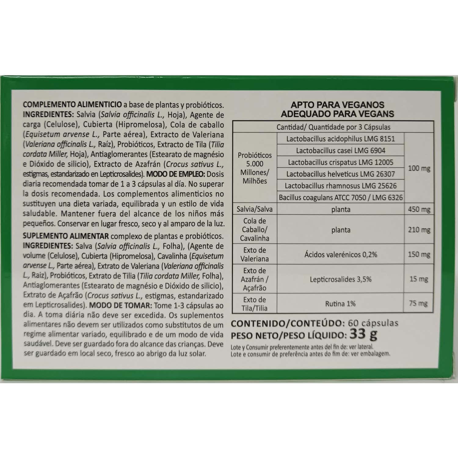 Complemento alimenticio a base de extracto de salvia, cola de caballo, valeriana y probióticos. Sus ingredientes tienen propiedades drenantes y equilibrantes que contribuyen a la regulación hormonal de la mujer y al bienestar intestinal.