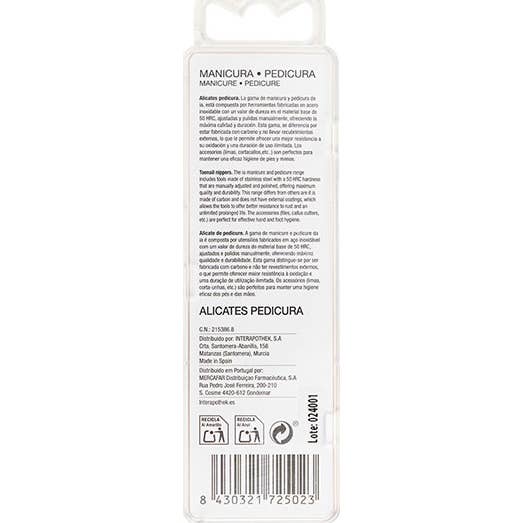 Interapothek Alicates Pedicura 1 ud es una herramienta para el cuidado preciso de las uñas de manos y pies. Está fabricada en acero inoxidable de alta dureza (50 HRC) y ofrece un corte limpio y controlado, apto para uso doméstico o profesional.