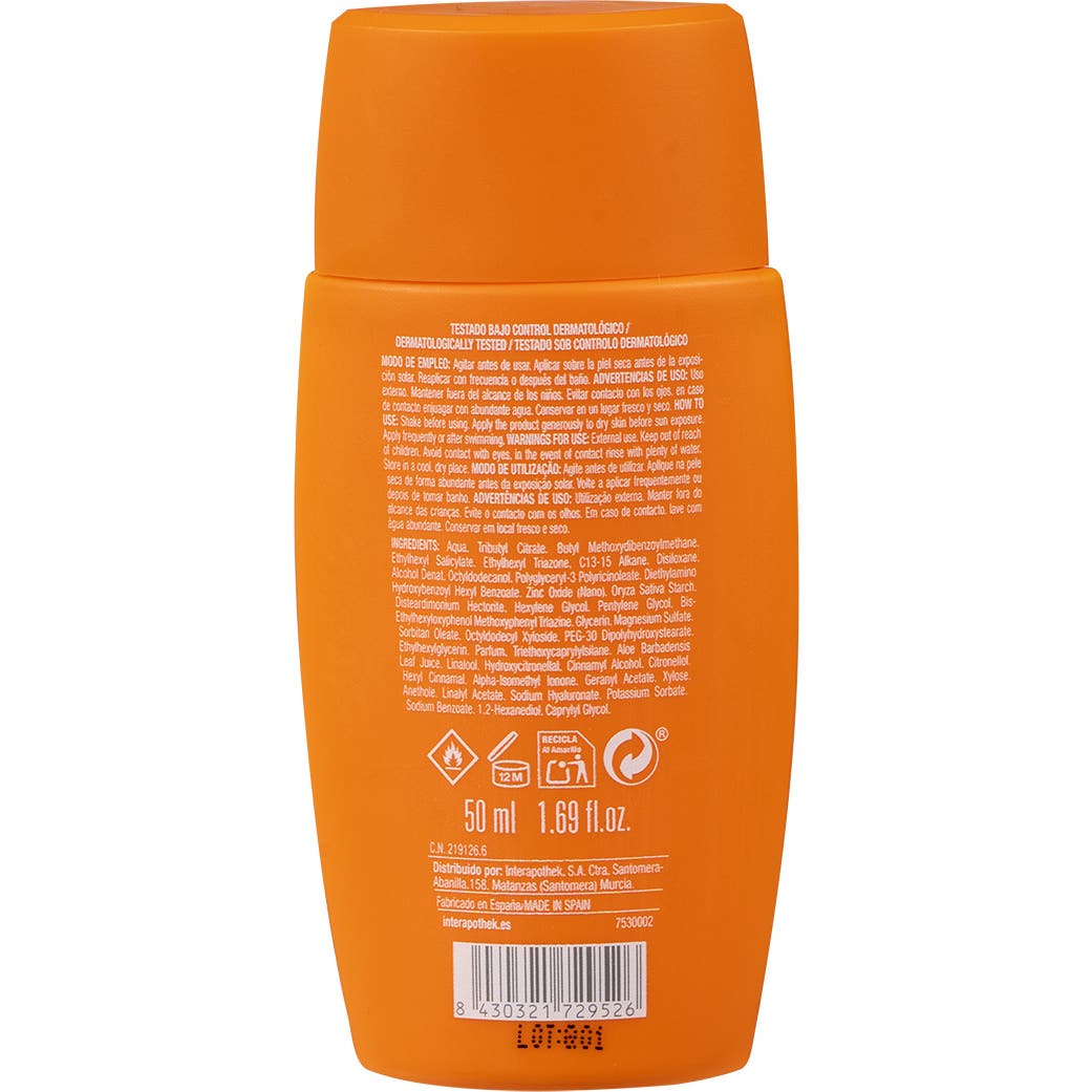 Interapothek Emulsión Solar Ultraligera Facial Spf50+ 50ml es una crema facial diseñada para ofrecer una protección solar de muy alta calidad. Este producto es resistente al agua, lo que lo convierte en una opción ideal para actividades al aire libre. Su textura es cremosa y ultraligera, permitiendo una rápida absorción en la piel.