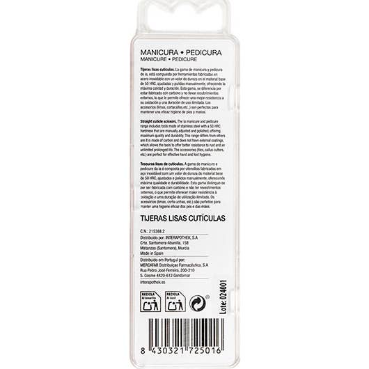 Interapothek Tijeras Cutículas Lisas 1 ud son unas tijeras para el recorte preciso de cutículas en manos y pies. Están fabricadas en acero inoxidable de alta dureza (50 HRC) con carbono y sin recubrimientos externos.