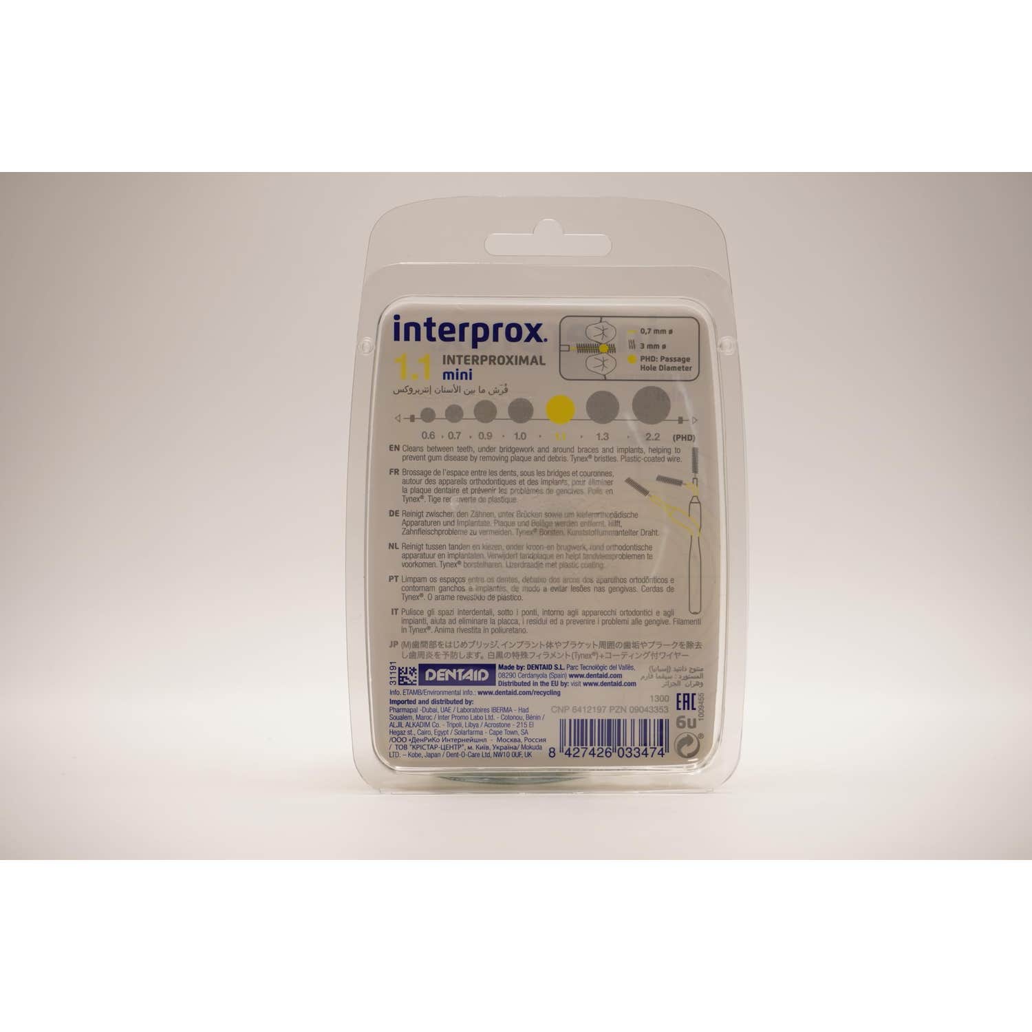 El tamaño del cepillo es perfecto para espacios interdentales de como mínimo 1,1 mm y se trata de un producto especialmente eficaz en la parte frontal de la boca.