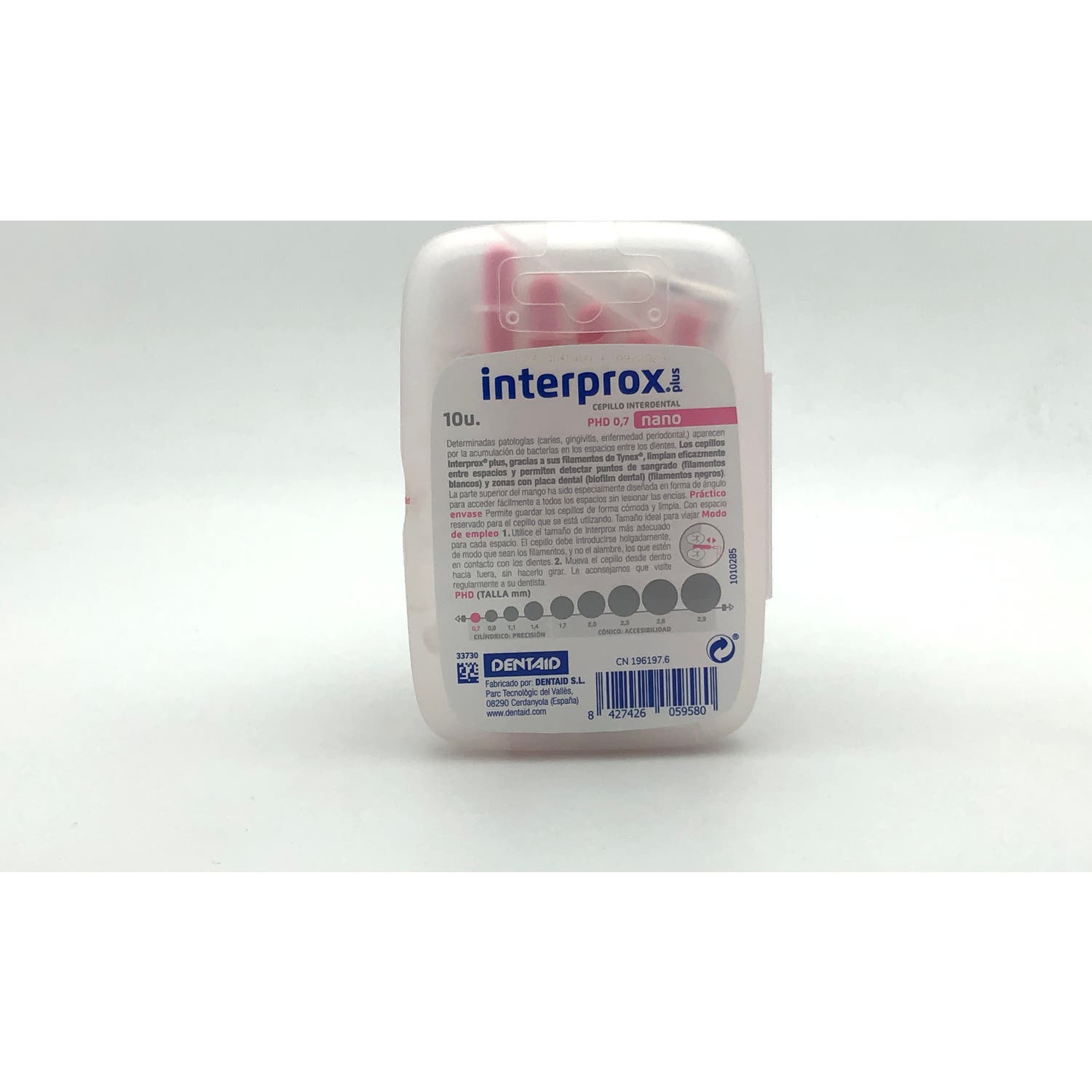 Interprox Plus Nano 10uds es un cepillo de higiene dentaria Dentaid, especial para quitar la placa bacteriana acumulada en los espacios interdentales de 1,1mm en las áreas molares y premolares. Incorpora un cabezal en ángulo que facilita su entrada perpendicular en las zonas para no herir las encías. Los filamentos del cepillo están elaborados en Tynex, un elemento registrado y patentado de óptima calidad para cuidar la salud oral. Estos filamentos vienen blancos para detectar sangrado y negros para evidenciar la presencia de placa.