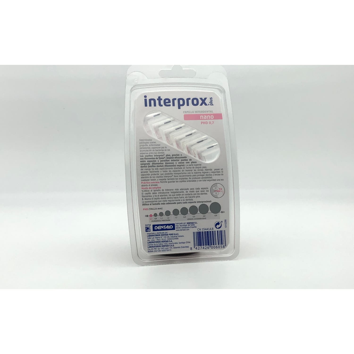 Interprox Plus Nano 6uds es un cepillo interdental diseñado para eliminar la placa bacteriana que se acumula en los espacios interproximales de al menos 0,6mm, concretamente de la zona premolar o molar.