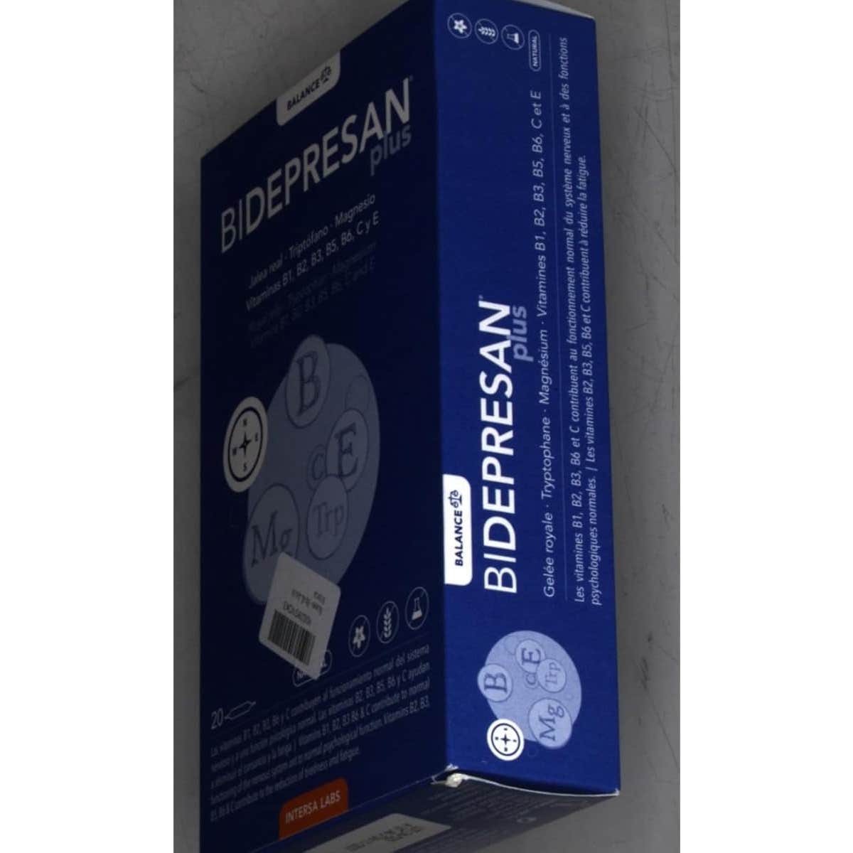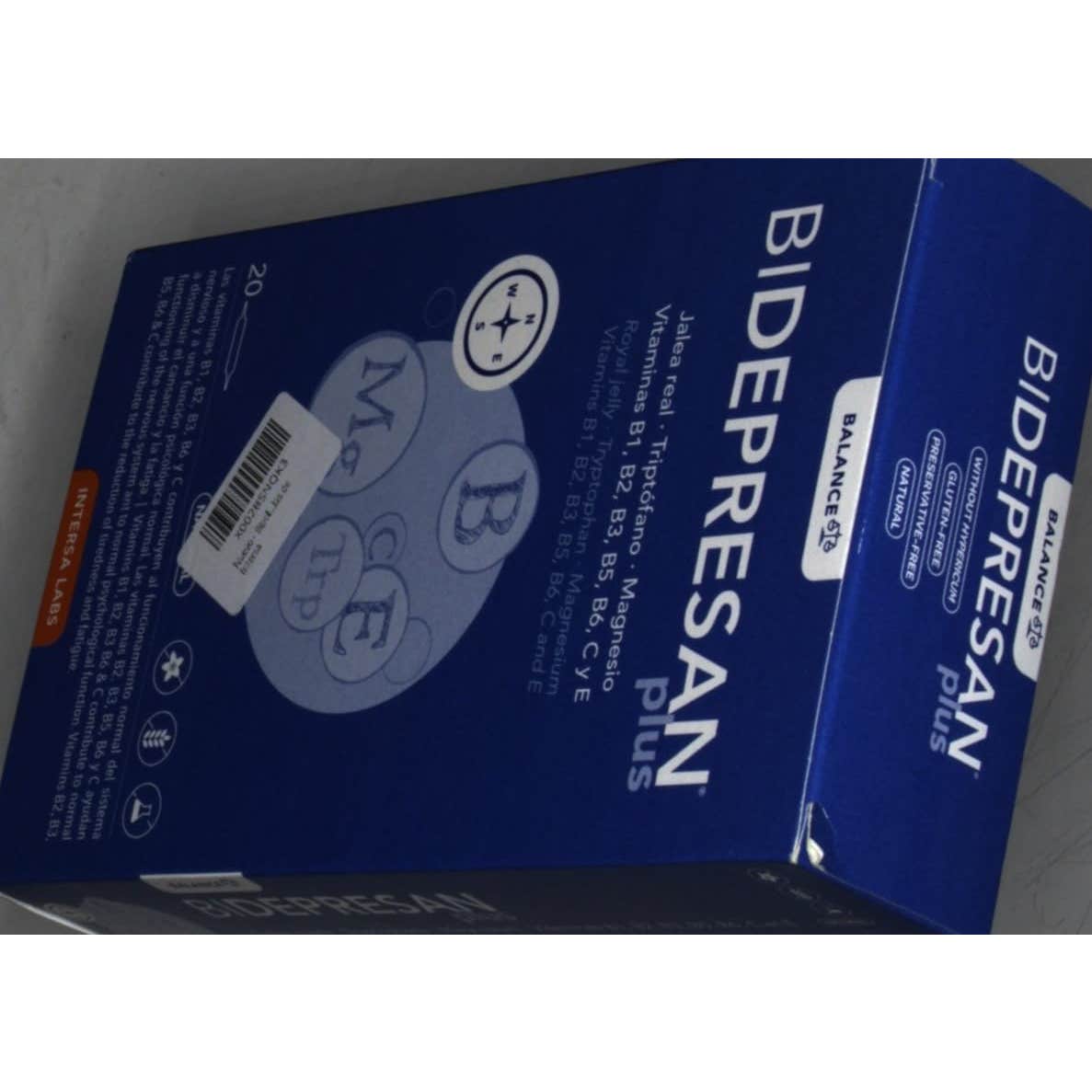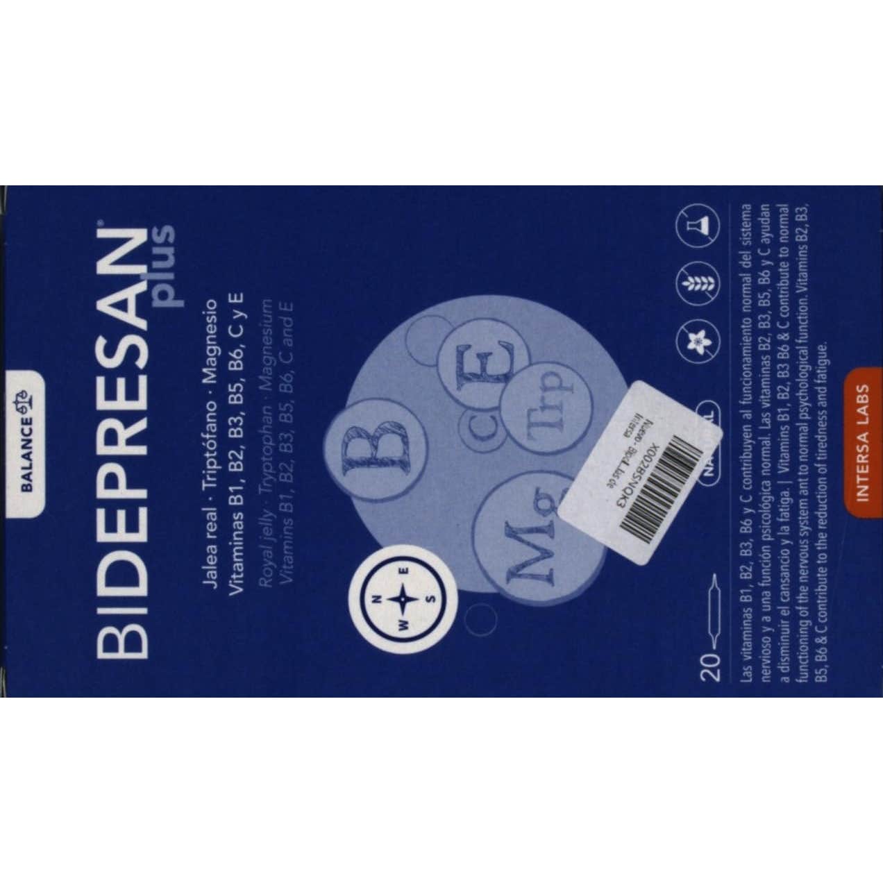 Intersa Bidepresan Plus 20amp es un complemento alimenticio en forma de ampolla con vitaminas B1, B2, B3, B6 y C. Contribuye al funcionamiento normal del sistema nervioso y a la función psicológica normal, y ayuda a disminuir la fatiga y el cansancio.