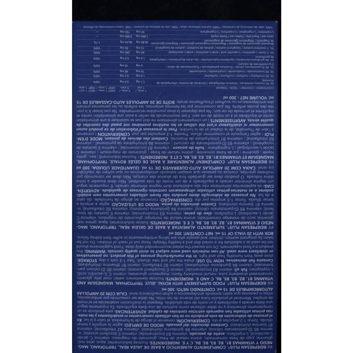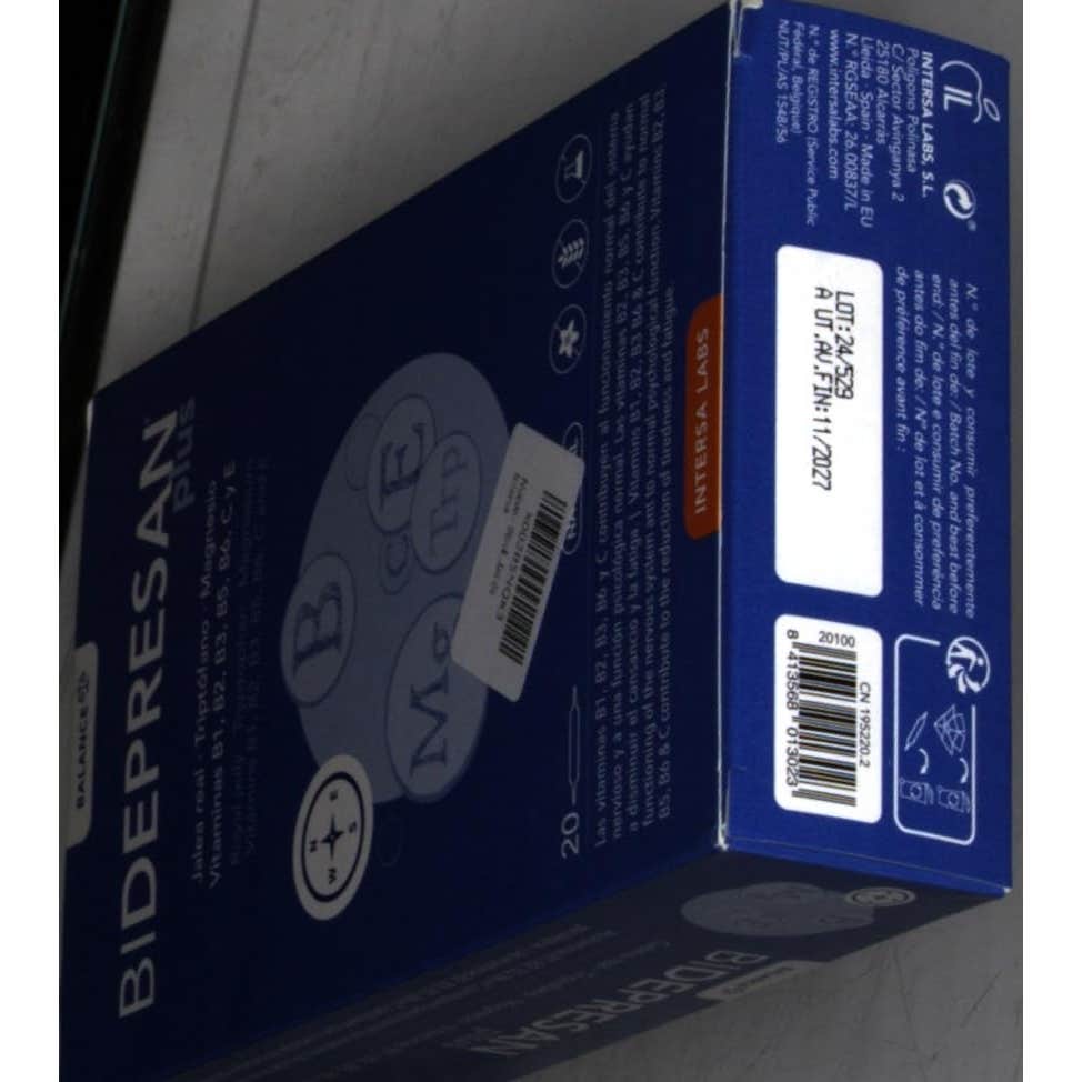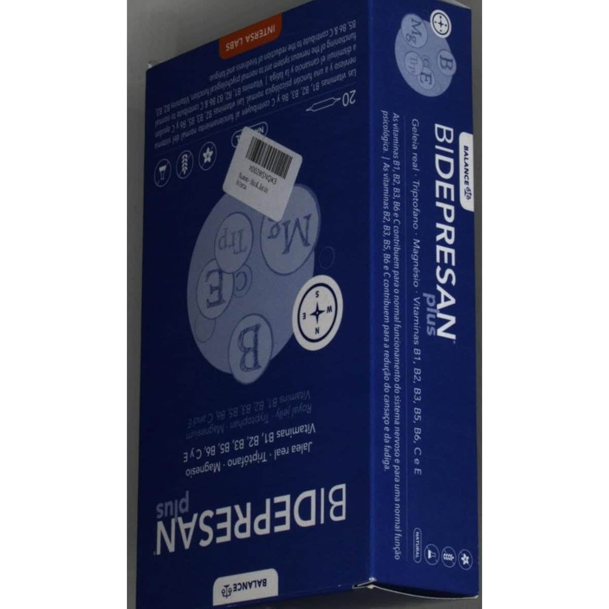 Intersa Bidepresan Plus 20amp es un complemento alimenticio en forma de ampolla con vitaminas B1, B2, B3, B6 y C. Contribuye al funcionamiento normal del sistema nervioso y a la función psicológica normal, y ayuda a disminuir la fatiga y el cansancio.