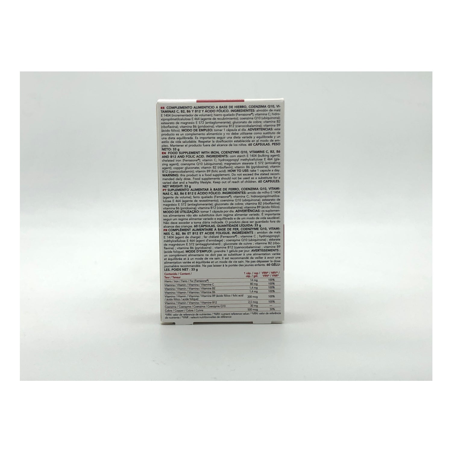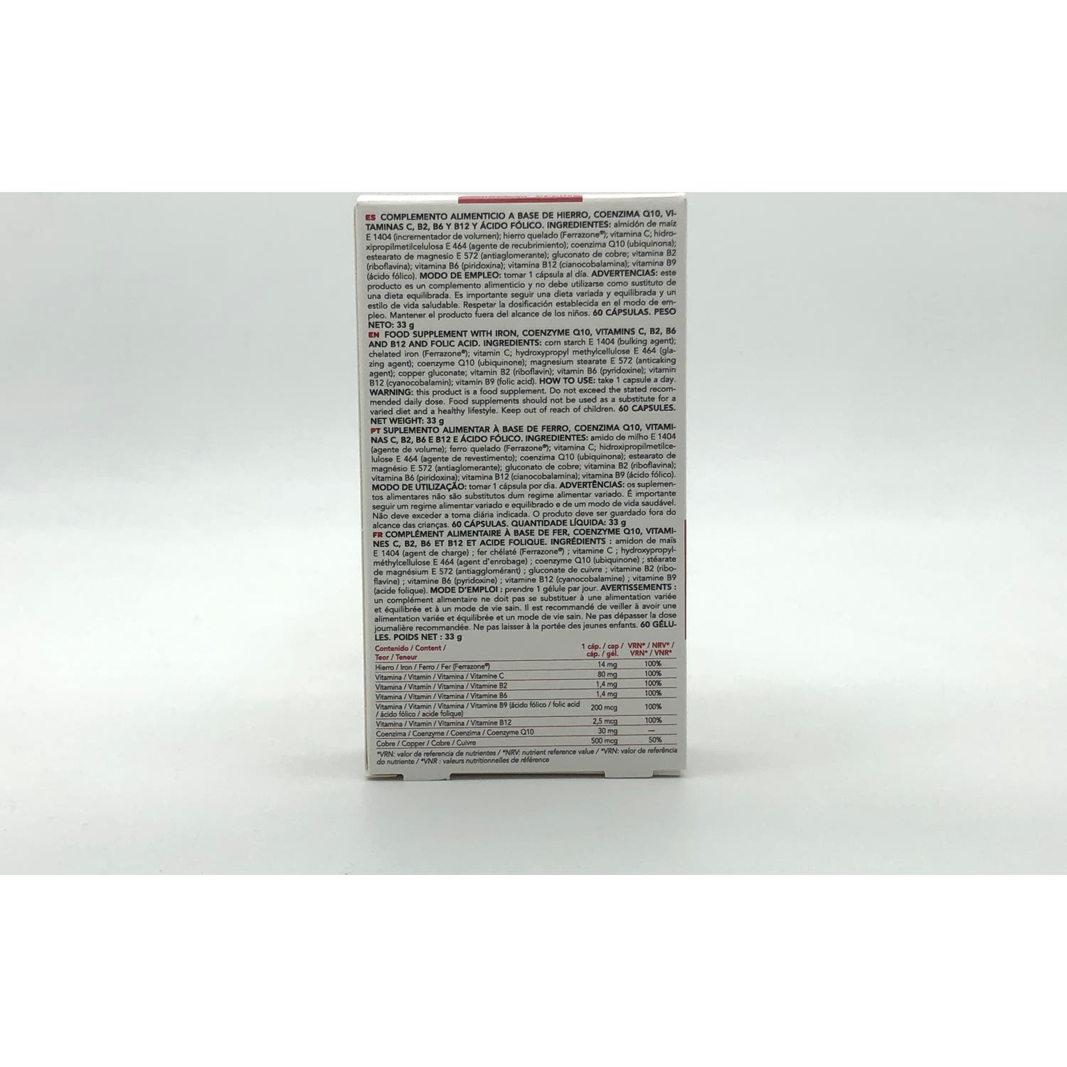 Suplemento alimenticio para mejorar la salud corporal. Aporta hierro, ácido fólico, vitaminas C, B2, B6 y B12 y coenzima Q10. La vitamina C ayuda a mejorar la absorción del hierro y tiene propiedades antioxidantes. El hierro favorece la formación de glóbulos rojos y hemoglobina de la sangre. Con folatos que ayudan a disminuir el cansancio y la fatiga. Sin sabor metálico.
