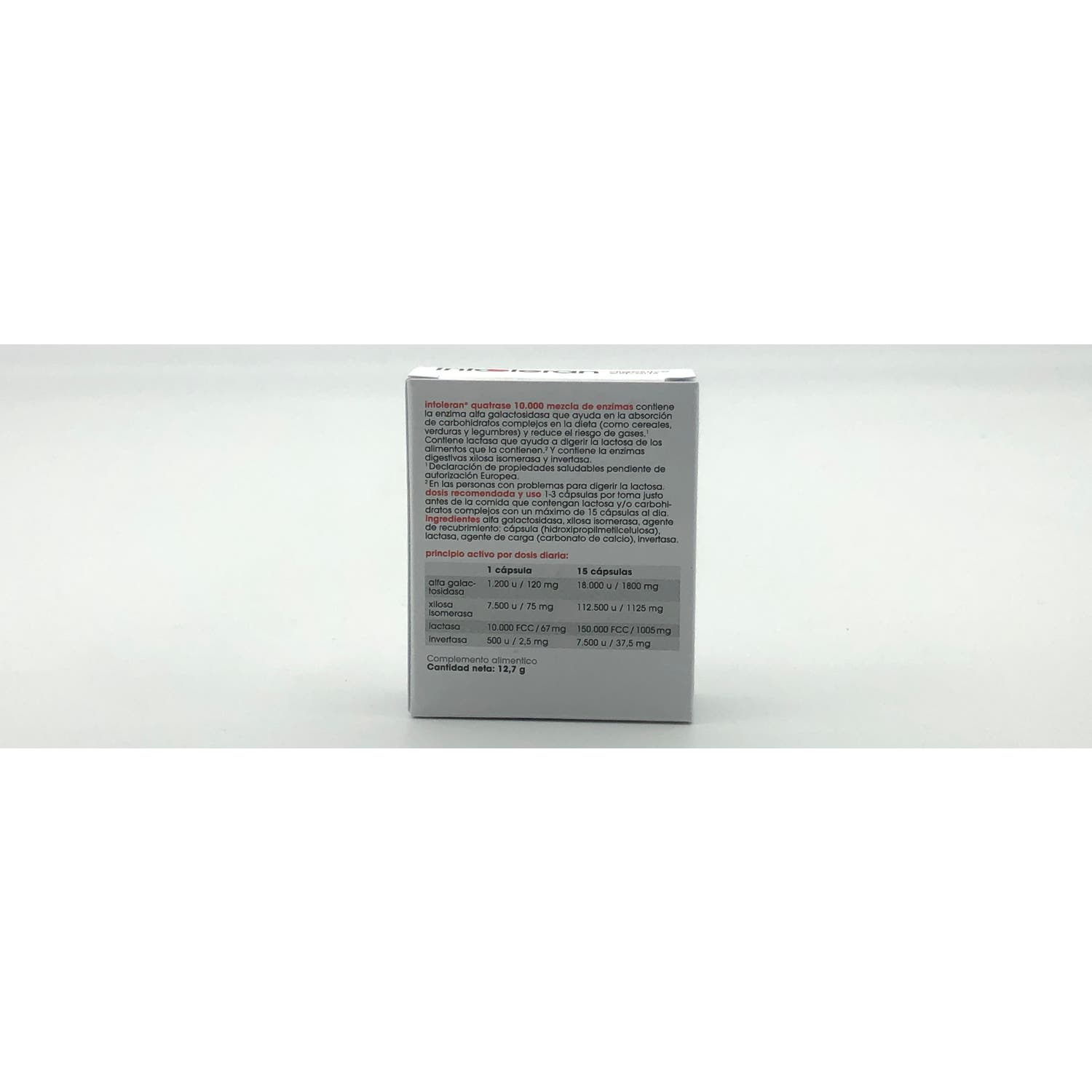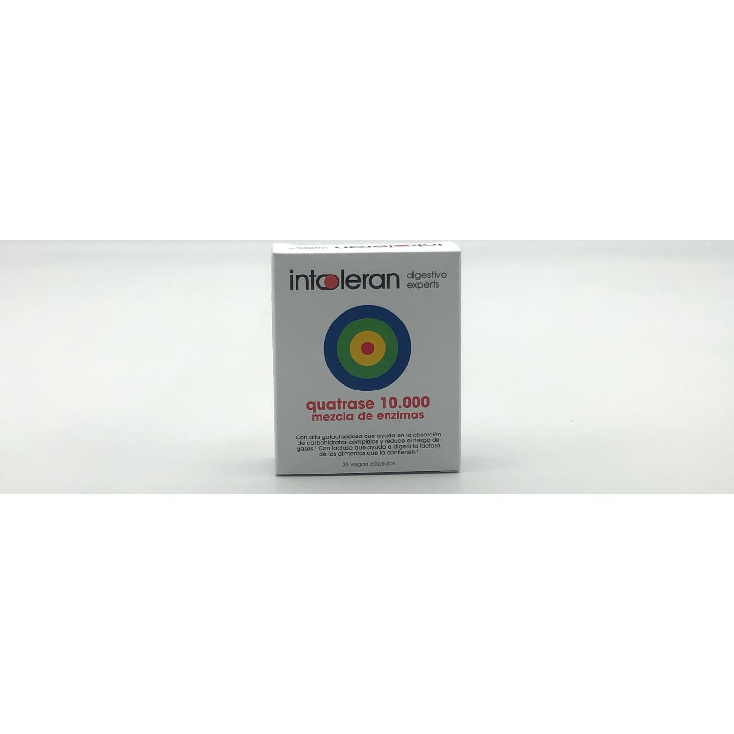 Intoleran Quatrase 10.000 36caps es un complemento alimenticio formulado con una mezcla de enzimas digestivas, especialmente indicadas para digerir hidratos de carbono complejos, como los fructanos y galactanos, que se pueden encontrar en alimentos como legumbres, verduras y cereales.