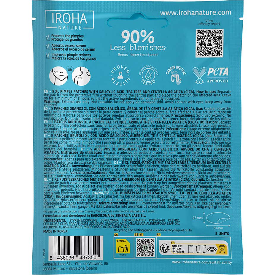 Iroha Nature Acne Prone Skin Parches Hidrocoloide XL 5 uds es un producto diseñado específicamente para abordar los brotes de granos en el rostro y el cuerpo, incluyendo áreas como: