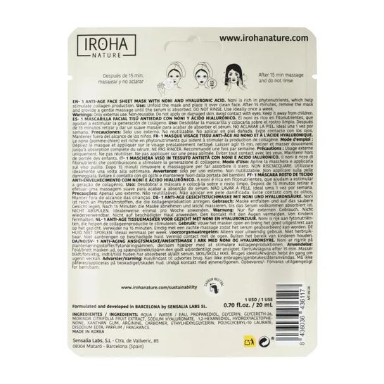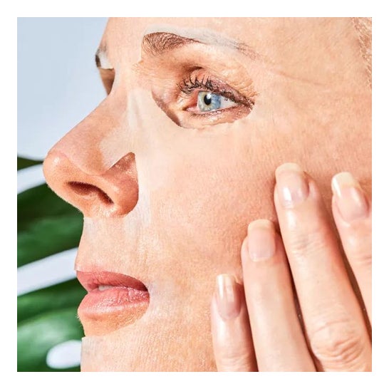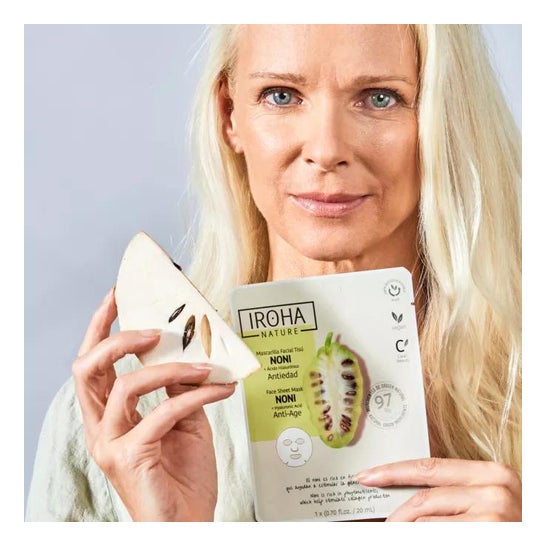 Mascarilla facial con acción antiedad. Formulada para revitalizar y reducir imperfecciones causadas por la edad. Elaborada a partir de un 97% de ingredientes certificados de origen natural, entre sus activos está el noni, una planta rica en nutrientes que incluye vitamina A y C, flavonoides, potasio, ácido linoleico y aminoácidos. Esta ayuda a mejorar el tono y la elasticidad de la piel, reduciendo así las líneas de expresión.
