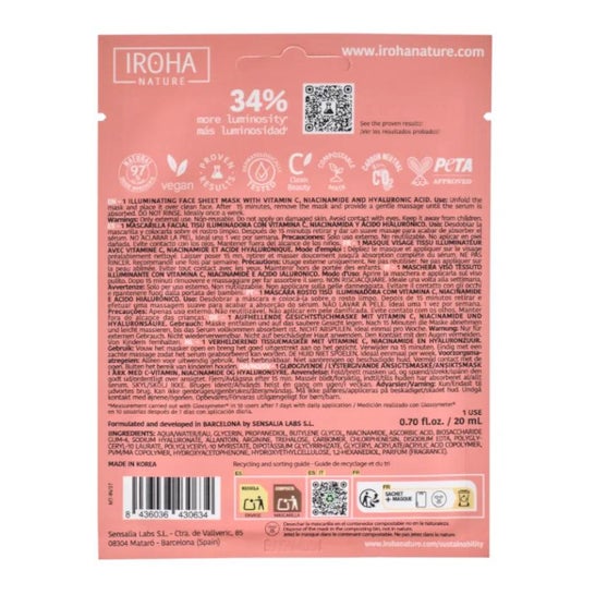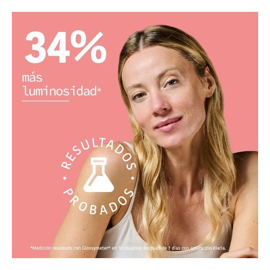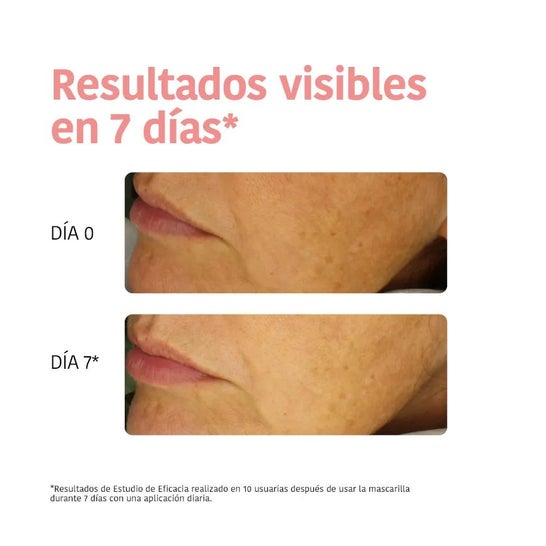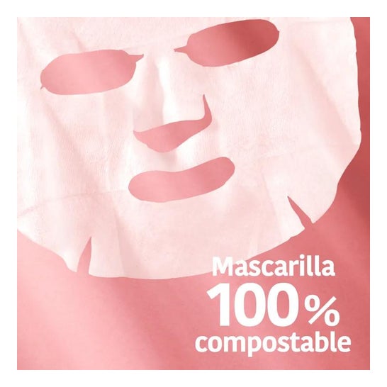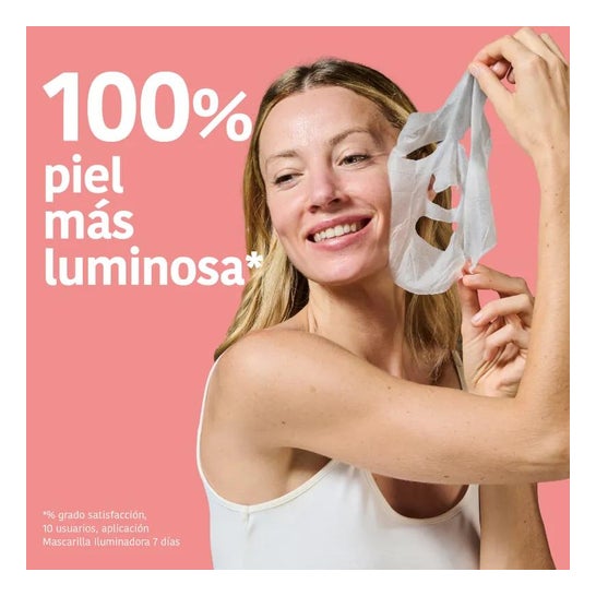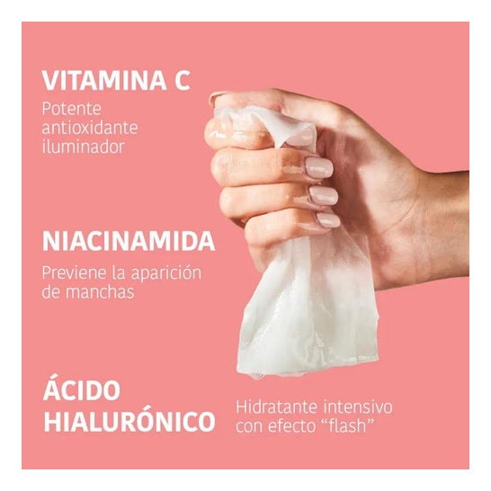 Mascarilla facial que ayuda a mejorar el aspecto de las pieles apagadas y deshidratadas. Entre sus principales ingredientes se encuentra la Vitamina C pura, que funciona como un antioxidante natural que actúa frente al envejecimiento y mejora la luminosidad y textura de la piel. La niacinamida ofrece múltiples beneficios como ayudar a reducir la apariencia de líneas finas y arrugas, reducir el enrojecimiento, mejorar la renovación celular y reducir la apariencia de manchas oscuras para conseguir una mayor luminosidad en la piel. El ácido hialurónico se encarga de aportar una hidratación intensiva con efecto flash a la piel, mientras mejora la elasticidad, ayuda a rellenar las pequeñas arrugas y reafirmar la piel. Por último, la alantoína suaviza la piel favoreciendo la renovación celular y aporta propiedades curativas y cicatrizantes. Está indicada para pieles que tienen manchas y/o están apagadas.