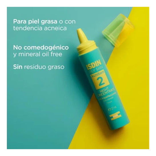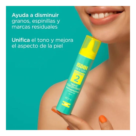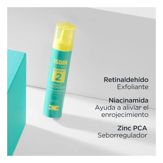 ISDIN Oily Skin Acniben Night Concentrate Sérum Anti-imperfecciones 27ml es un sérum que contribuye a devolverle la luminosidad a la piel grasa y con tendencia acneica. Su fórmula está enriquecida con zinc PCA, niacinamida y retinaldehido; ingredientes que ayudan a disminuir y prevenir la aparición de granos, puntos negros o marcas residuales en la piel. Asimismo, contribuye a reducir la irritación cutánea. Contiene 27ml.