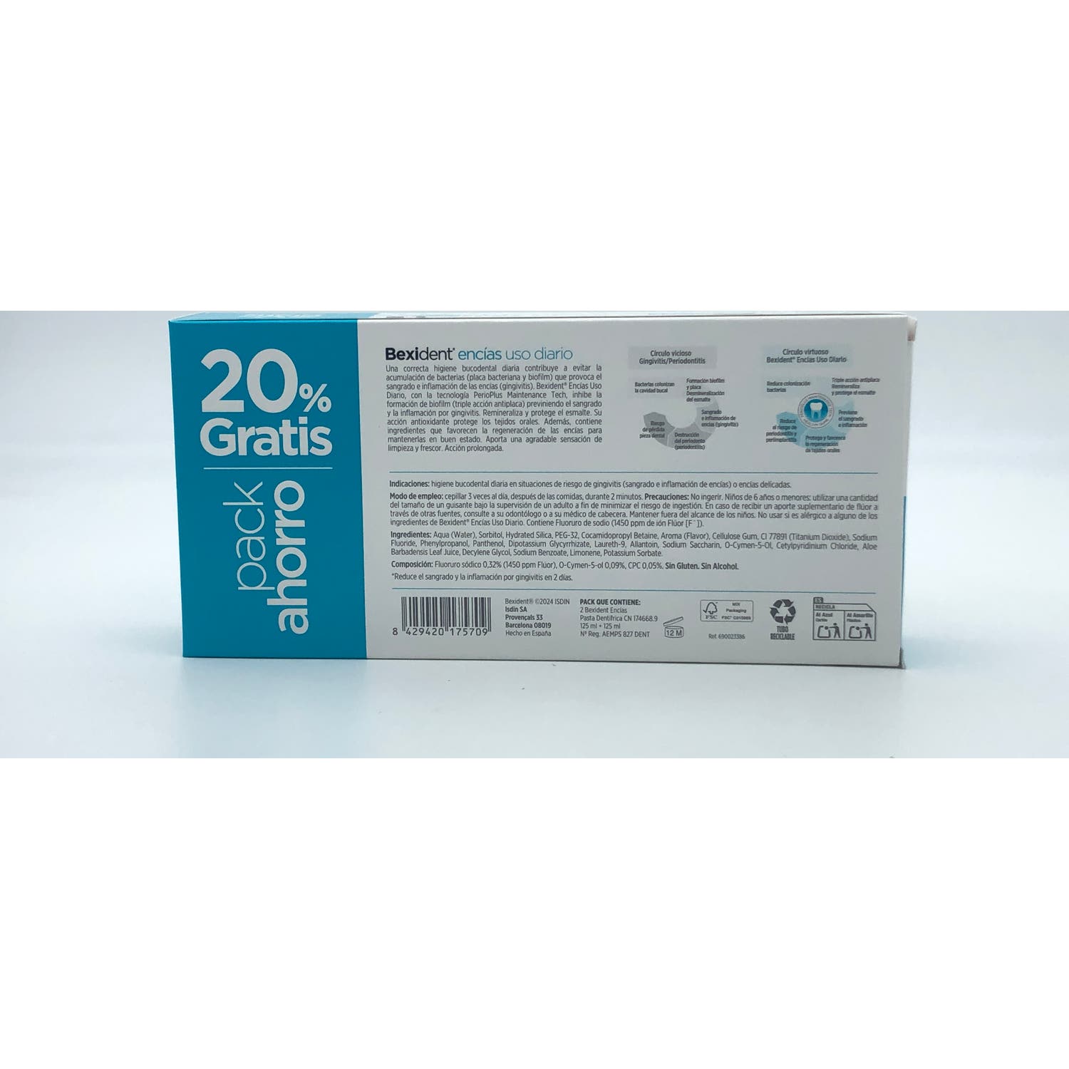 ISDIN Bexident Encías Uso Diario CPC + Cymenol Pasta 2x125ml es una pasta dentífrica para el cuidado de las encías. Es un tratamiento que ayuda a evitar los síntomas de enfermedades bucales como la inflamación de las encías. Funciona con un compuesto antimicrobiano que actúa como antiséptico para mantener la higiene bucal del usuario.