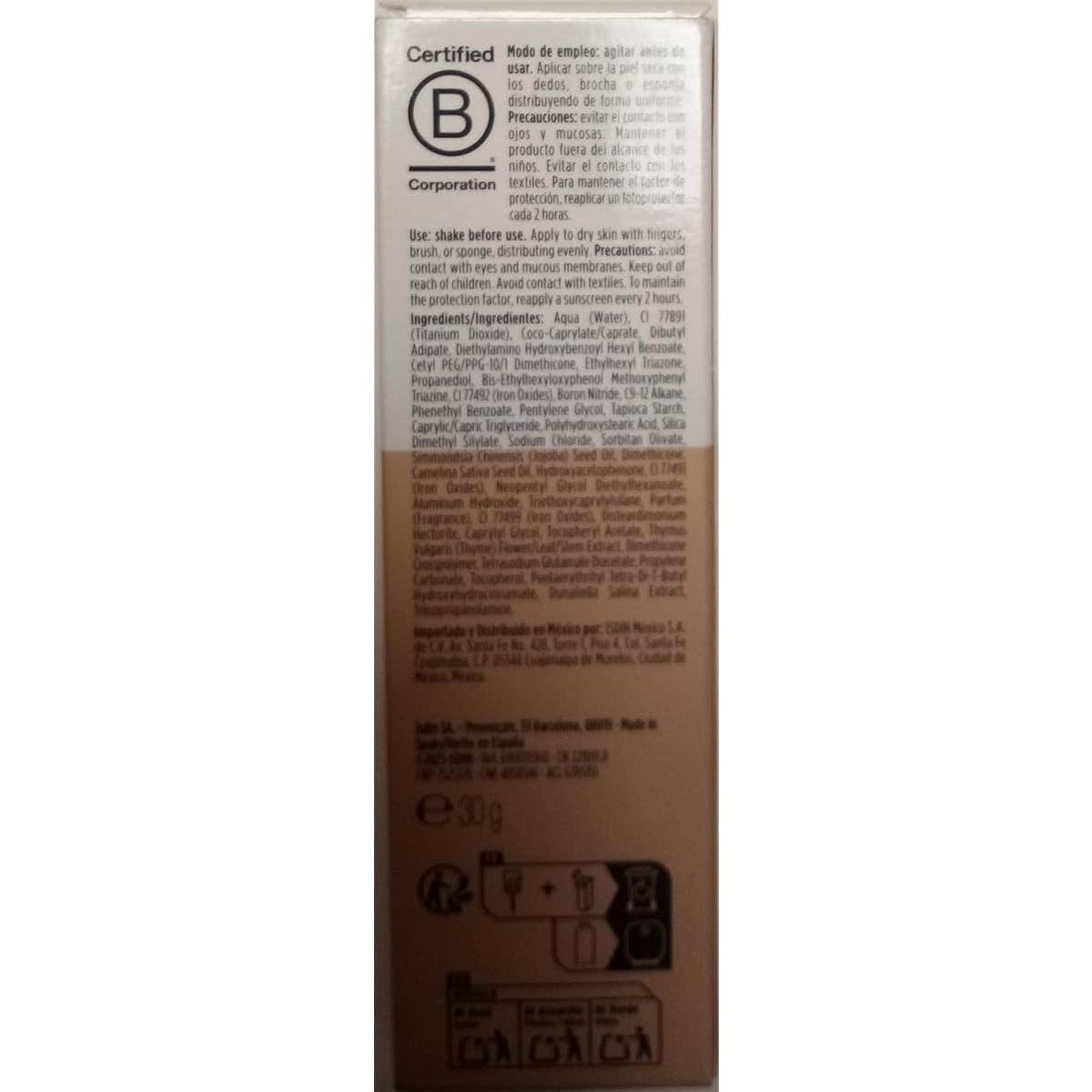 Ingredients/Ingredientes: Aqua (Water), CI 77891 (Titanium Dioxide), Coco-Caprylate/Caprate, Dibutyl Adipate, Diethylamino Hydroxybenzoyl Hexyl Benzoate, Cetyl PEG/PPG-10/1 Dimethicone, Ethylhexyl Triazone, Propanediol, Bis-Ethylhexyloxyphenol Methoxyphenyl Triazine, CI 77492 (Iron Oxides), Boron Nitride, C9-12 Alkane, Phenethyl Benzoate, Pentylene Glycol, Tapioca Starch, Caprylic/Capric Triglyceride, Polyhydroxystearic Acid, Silica Dimethyl Silylate, Sodium Chloride, Simmondsia Chinensis (Jojoba) Seed Oil, Polyglyceryl-3 Distearate, Dimethicone, Camelina Sativa Seed Oil, Hydroxyacetophenone, CI 77491 (Iron Oxides), Neopentyl Glycol Diethylhexanoate, Aluminum Hydroxide, Triethoxycaprylylsilane, Parfum (Fragrance), CI 77499 (Iron Oxides), Disteardimonium Hectorite, Caprylyl Glycol, Tocopheryl Acetate, Thymus Vulgaris (Thyme) Flower/ Leaf/Stem Extract, Dimethicone Crosspolymer, Tetrasodium Glutamate Diacetate, Propylene Carbonate, Glyceryl Stearate Citrate, Tocopherol, Pentaerythrityl Tetra-Di-T-Butyl Hydroxyhydrocinnamate, Dunaliella Salina Extract, Triisopropanolamine.