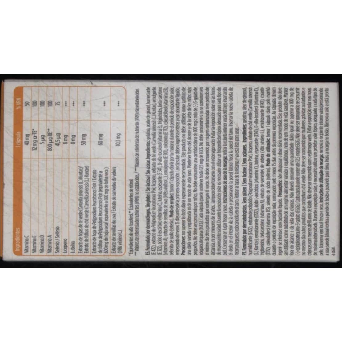 Elaborado a base del complejo VitAox Ultra con vitaminas antioxidantes, carotenoides, minerales y extractos de origen natural. Además de vitamina D, luteína y betacaroteno ayudan a mejorar la salud ocular y a preparar la piel ante la exposición solar.
