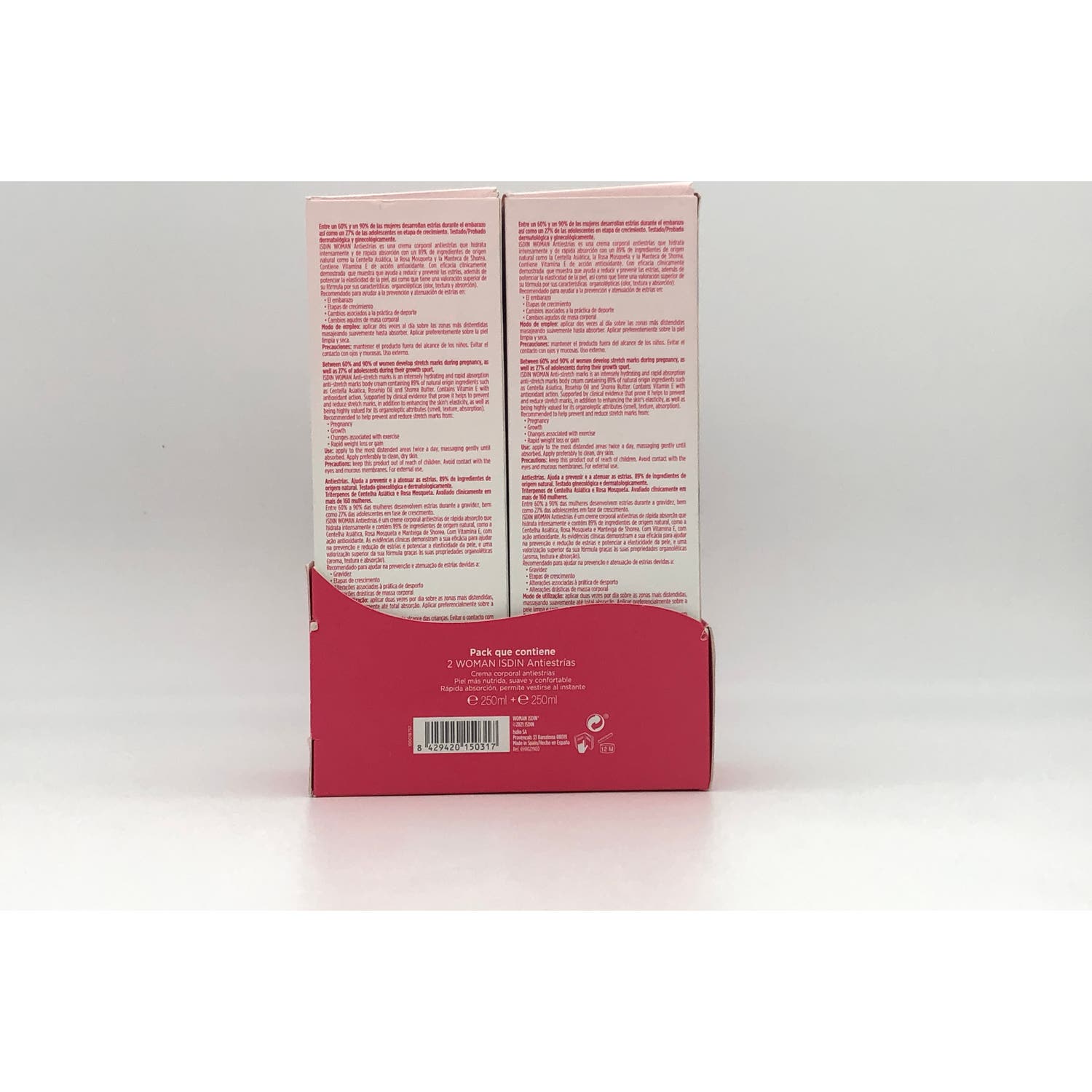 ISDIN Woman Crema Antiestrías 2x250ml es un pack anti-estrías que potencia la elasticidad de la piel y ayuda a combatir las estrías vinculadas con la pubertad, el embarazo o la pérdida de peso.