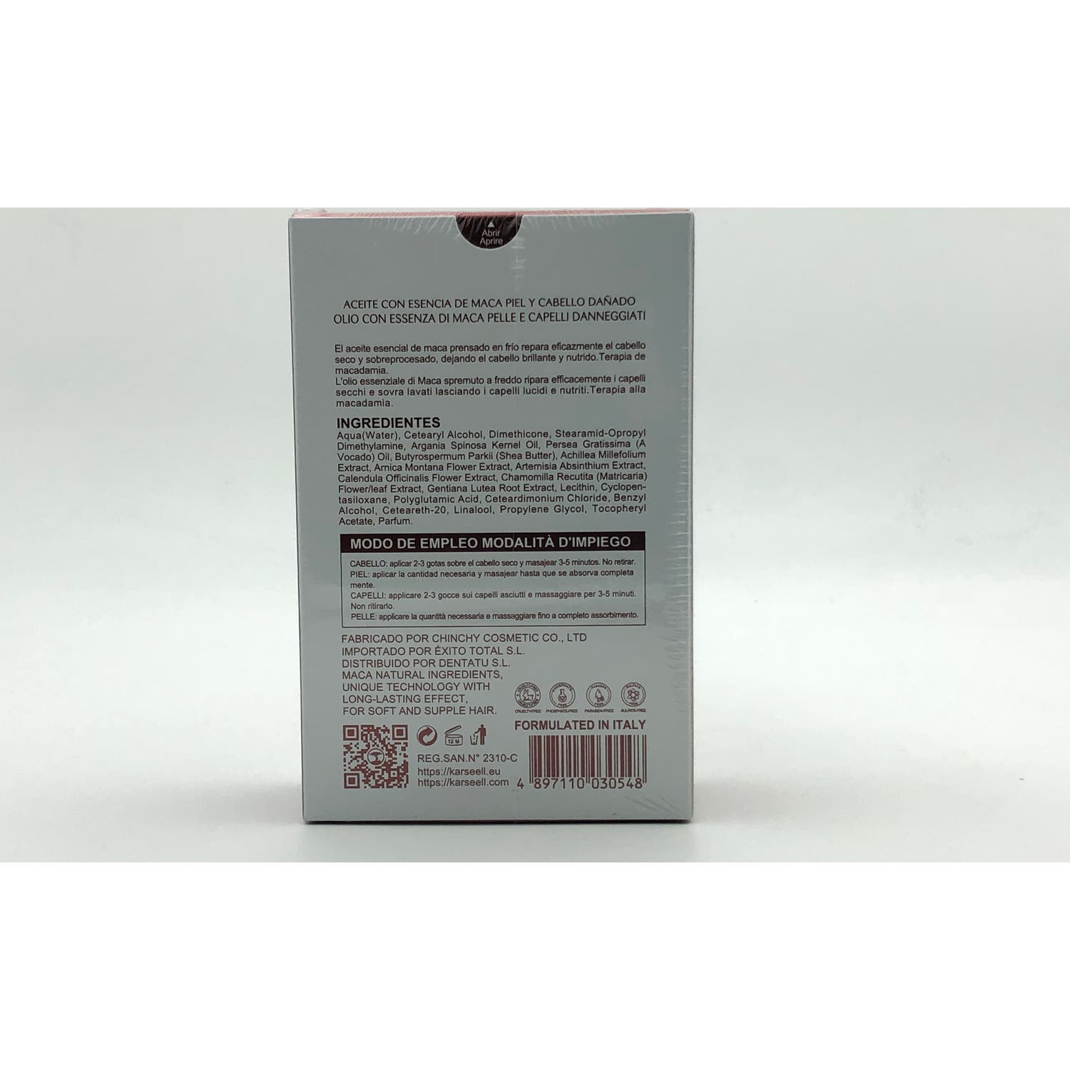 El Karseell Oil Maca Essence es un suero capilar diseñado para nutrir, reparar y revitalizar el cabello en profundidad. Su fórmula, enriquecida con una combinación de ingredientes naturales como el aceite de argán y la esencia de maca, transforma el cabello seco y dañado en una melena suave, brillante y manejable desde la primera aplicación.