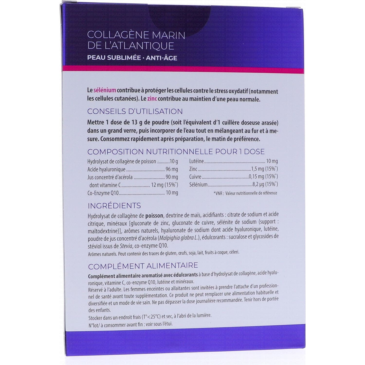 El colágeno marino sublimado y antienvejecimiento de la piel de Bretaña contribuye al mantenimiento de la piel normal y ayuda a proteger las células de la piel contra el estrés oxidativo. Fórmula altamente concentrada 10 gramos de colágeno por día más ácido hialurónico, vitaminas, coenzima Q10, luteína y minerales. El selenio ayuda a proteger las células de la piel contra el estrés oxidativo. El zinc y la vitamina A ayudan a mantener una piel normal. Presentación 300g.