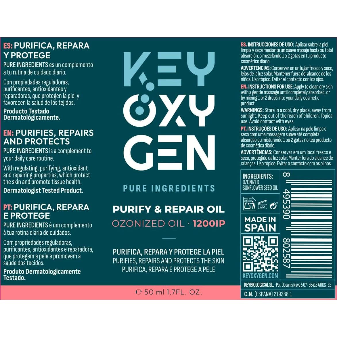 Keyoxygen Purify & Repair Oil 1200IP 50ml es un aceite innovador que combina las propiedades purificadoras y reparadoras de los aceites ozonizados para mejorar el cuidado diario de la piel. Formulado para todo tipo de pieles, su acción principal es limpiar en profundidad y restaurar la barrera cutánea, ofreciendo una solución eficaz para: