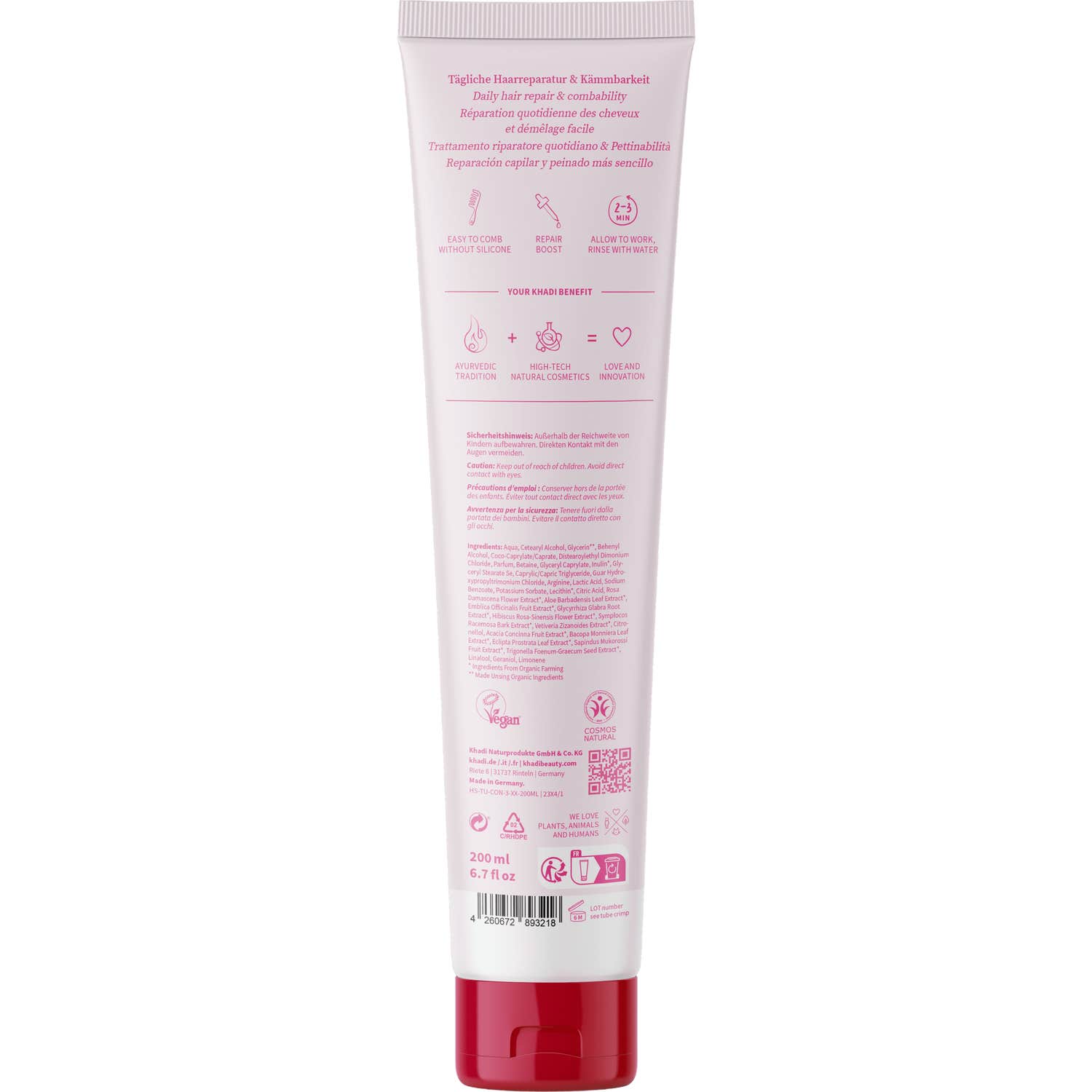 Con un pH que oscila entre 4,5 y 5,0, este acondicionador se adapta bien al cabello, ayudando a suavizar y alisar su superficie. Su aroma a rosa añade un toque sensorial al momento del cuidado capilar. Todos los acondicionadores de Khadi son completamente naturales, veganos y están exentos de siliconas, sulfatos, parabenos y otros aditivos químicos nocivos.