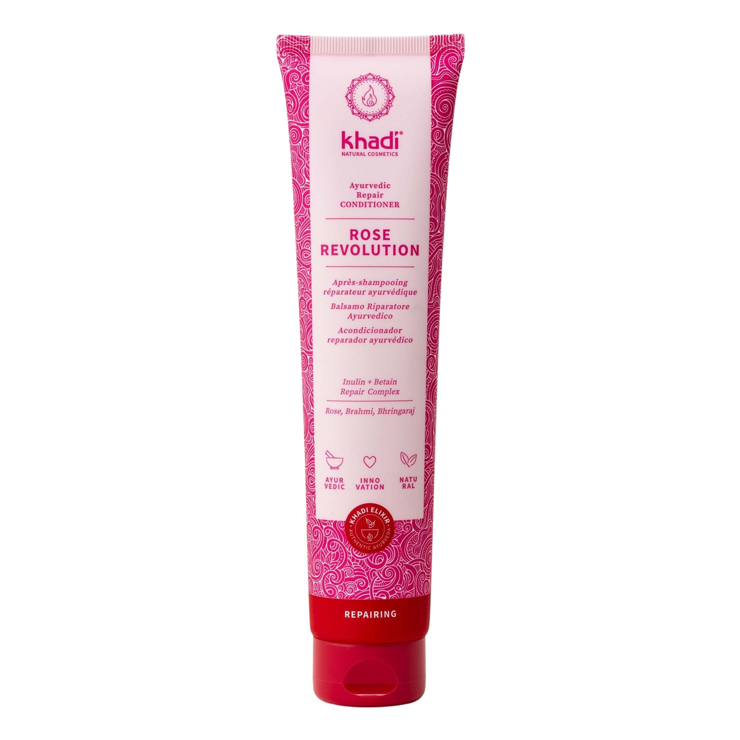 El Acondicionador Reparador Ayurvédico contiene un elixir reparador de rosas que se extrae mediante técnicas tradicionales de hierbas medicinales indias. Esta mezcla incluye ingredientes como:
