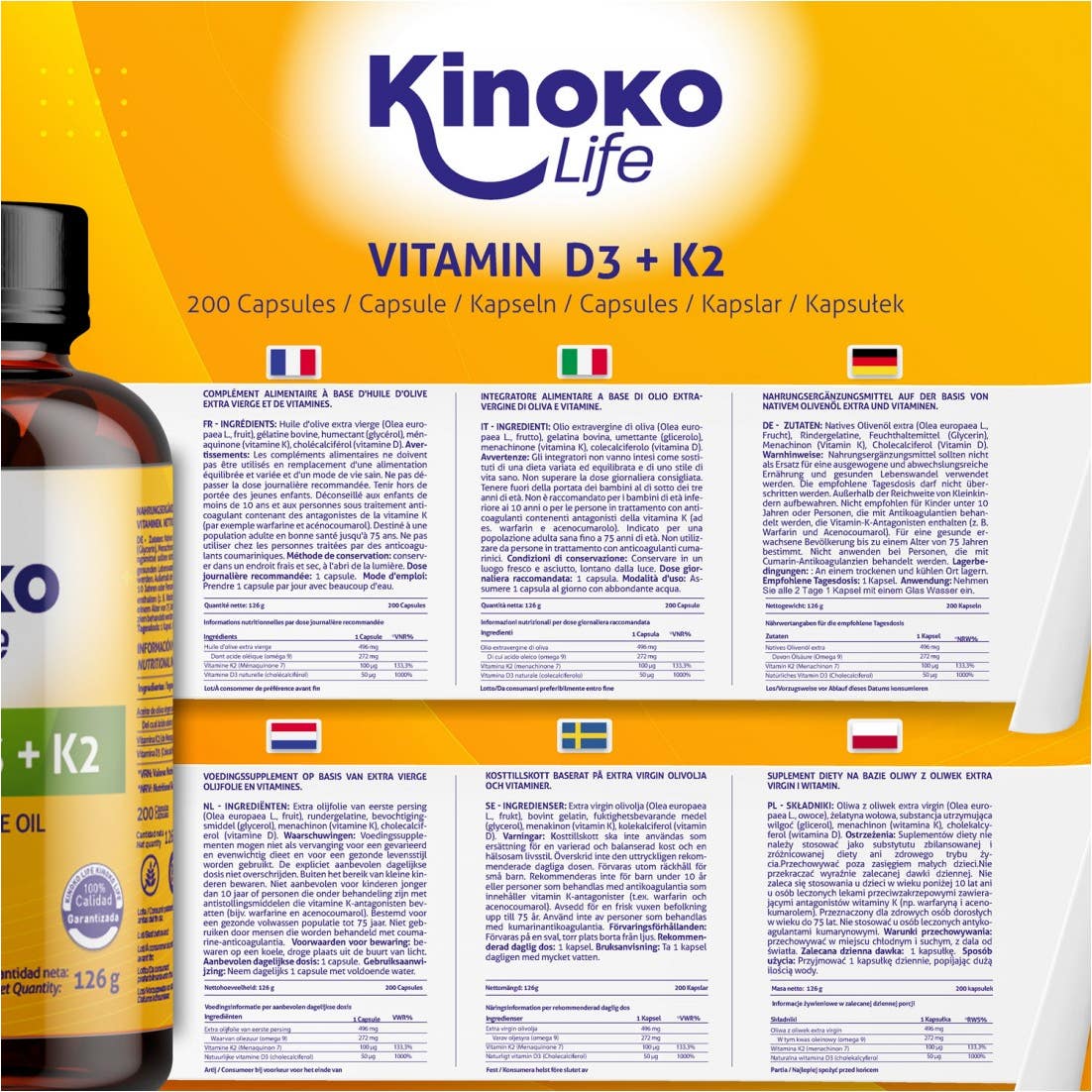 Kinoko Life Vitamina D3 + K2 con Omega 9 es un suplemento que presenta una fórmula avanzada, compuesta por 200 cápsulas líquidas. Cada cápsula contiene: