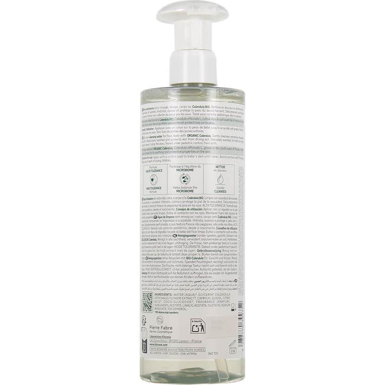 La fórmula de esta agua limpiadora está compuesta por ingredientes de origen natural en un 98%, incluyendo Caléndula procedente de flores cultivadas de forma orgánica. No contiene alcohol y ha sido sometida a pruebas bajo supervisión pediátrica, lo que asegura su seguridad para el cuidado de la piel del bebé.