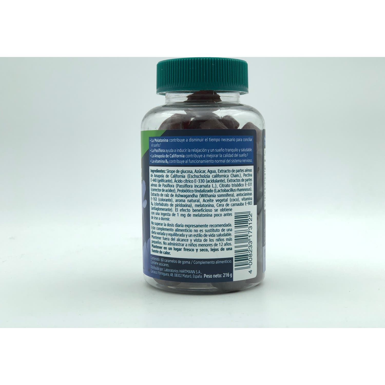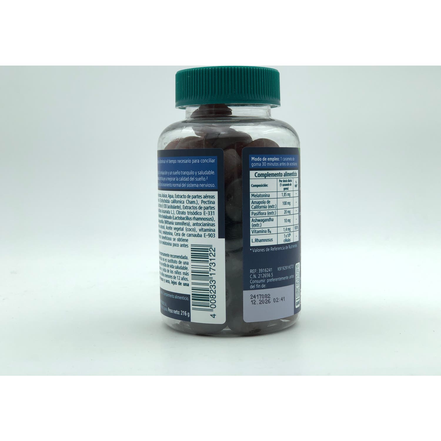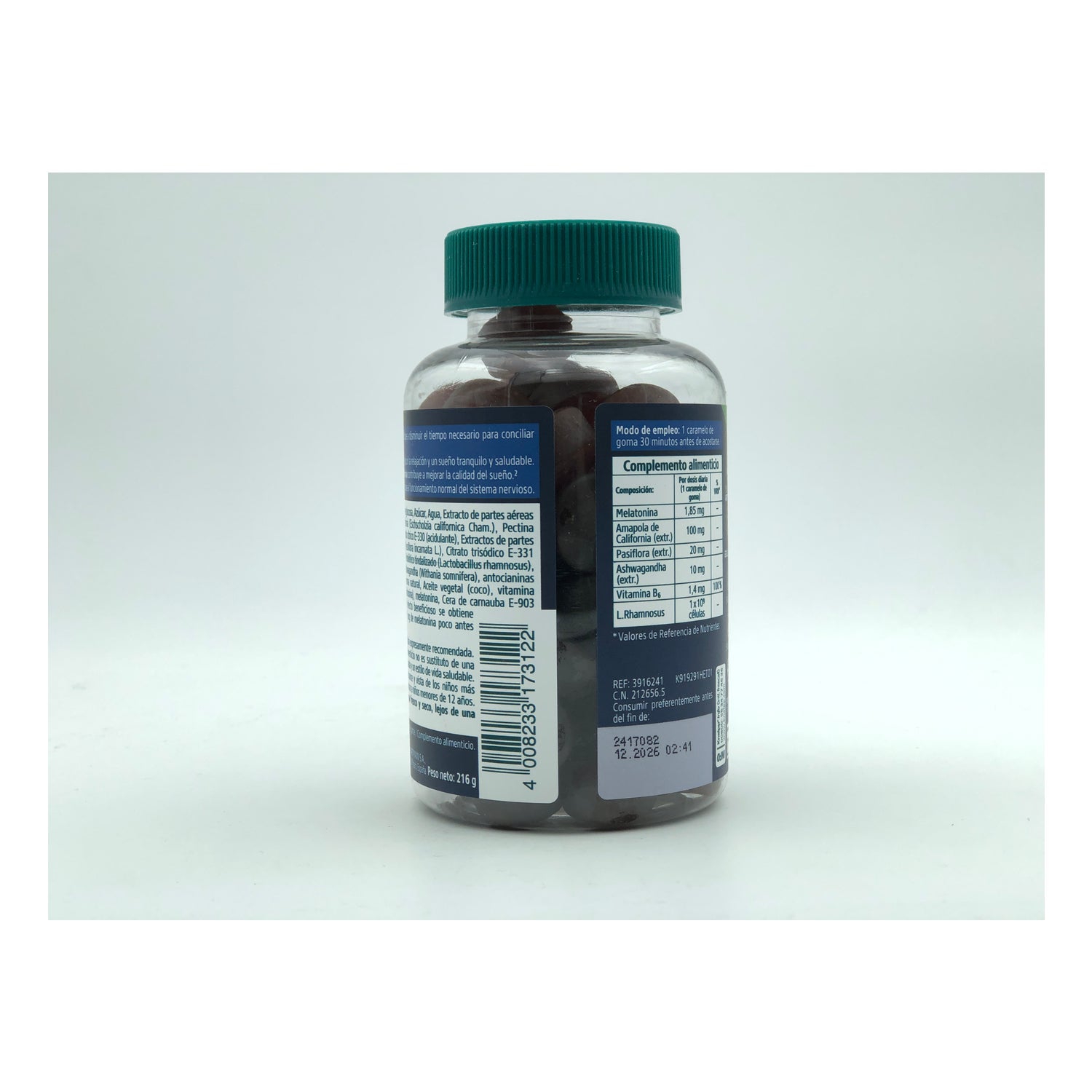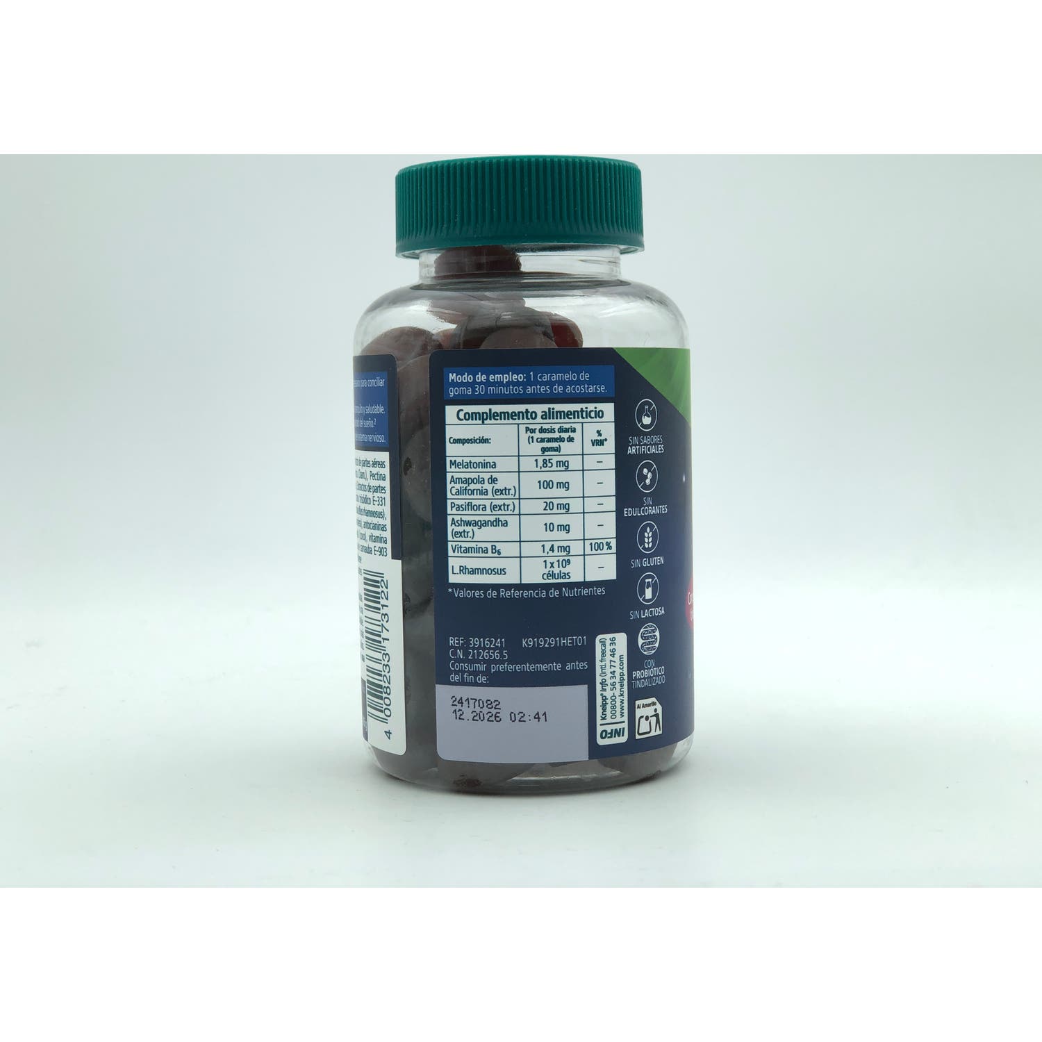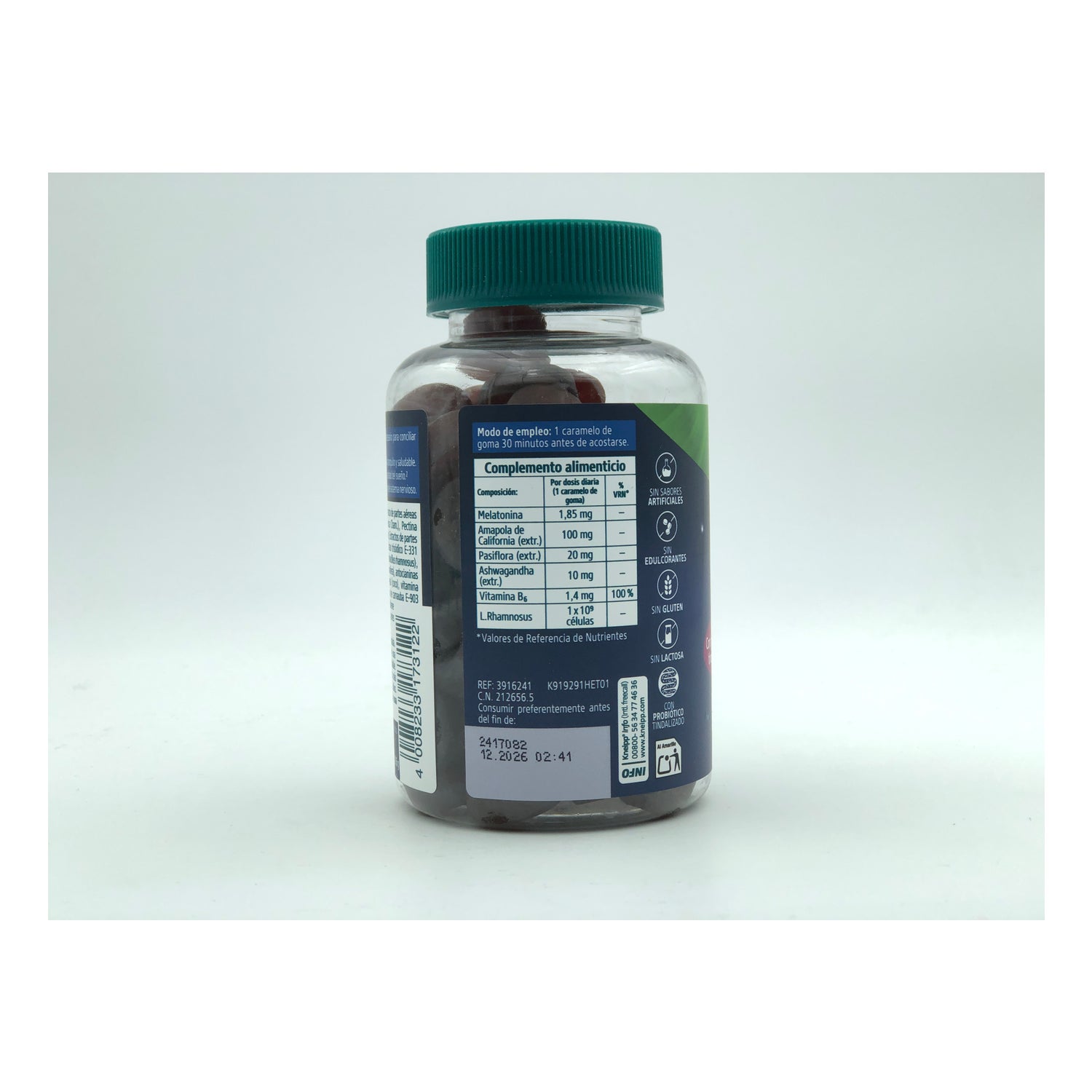 Contiene melatonina, amapola de california, pasiflora, ashwagandha, vitamina B6 y probiótico L. Rhamonosus.