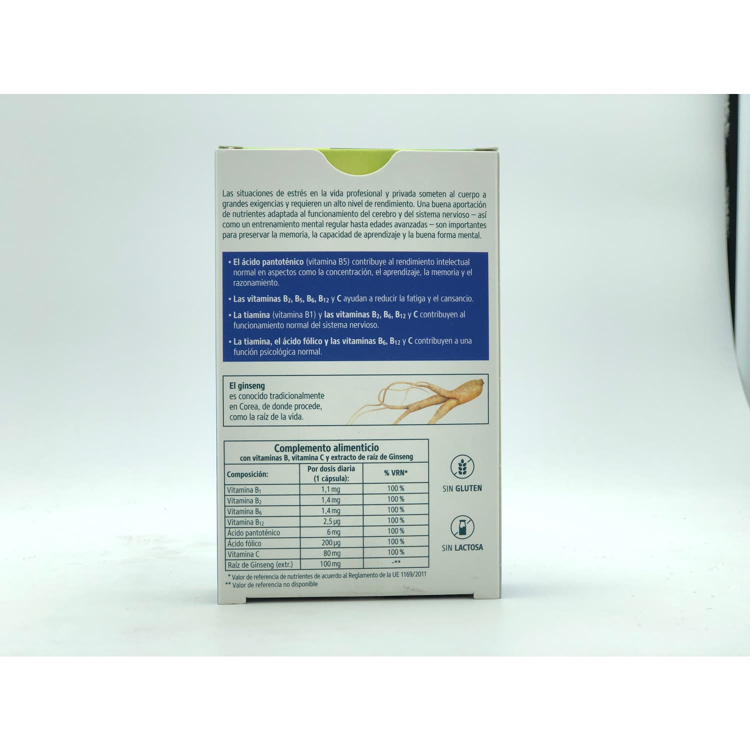 Complemento alimenticio formulado a base de vitaminas del grupo B, ácido pantoténico y panax ginseng. Caja de 30 comprimidos.