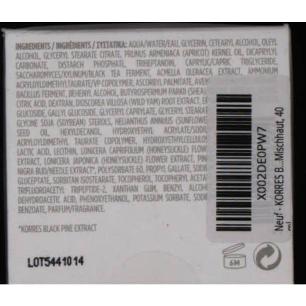 AQUA/WATER/EAU, GLYCERIN, CETEARYL ALCOHOL, OLEYL ALCOHOL, GLYCERYL STEARATE CITRATE, PRUNUS ARMENIACA (APRICOT) KERNEL OIL, DICAPRYLYL CARBONATE, DISTARCH PHOSPHATE, TRIHEPTANOIN, CAPRYLIC/CAPRIC TRIGLYCERIDE, ACCHAROMYCES/XYLINUM/BLACK TEA FERMENT, AMMONIUM CRYLOYLDIMETHYLTAURATE/VP COPOLYMER, ASCORBYL PALMITATE, AVENA STRIGOSA SEED EXTRACT, BACILLUS FERMENT, BEHENYL ALCOHOL, BUTYROSPERMUM PARKII (SHEA) BUTTER, CAPRYLYL GLYCOL, CITRIC ACID, DEXTRAN, DIOSCOREA VILLOSA (WILD YAM) ROOT EXTRACT, EPIGALLOCATECHIN GALLATE, EPIGALLOCATECHIN GALLATYL GLUCOSIDE, GLYCERYL CAPRYLATE, GLYCERYL STEARATE, GLYCINE SOJA (SOYBEAN) STEROLS, HELIANTHUS ANNUUS (SUNFLOWER) SEED OIL, HEXYLDECANOL, HYDROXYETHYL ACRYLATE/SODIUM ACRYLOYLDIMETHYL TAURATE COPOLYMER, HYDROXYETHYLCELLULOSE, LACTIC ACID, LECITHIN, LONICERA CAPRIFOLIUM, (HONEYSUCKLE) FLOWER EXTRACT, LONICERA JAPONICA (HONEYSUCKLE) FLOWER EXTRACT, PINUS NIGRA BARK EXTRACT*, PINUS NIGRA BUD/NEEDLE EXTRACT*, POLYSORBATE 60, SODIUM GLUCEPTATE, SORBITAN ISOSTEARATE, SPILANTHES ACMELLA FLOWER EXTRACT, TOCOPHEROL, TOCOPHERYL ACETATE, TRIFLUOROACETYL TRIPEPTIDE-2, XANTHAN GUM, PHENOXYETHANOL, POTASSIUM SORBATE, SODIUM BENZOATE, PARFUM/FRAGRANCE. *KORRES BLACK PINE EXTRACTS