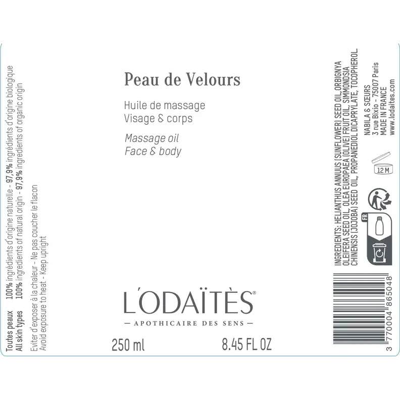 L'Odaïtès Peau de Velours Aceite de Masaje Rostro & Cuerpo es un producto diseñado para ofrecer una experiencia de hidratación y nutrición a la piel. Su formulación combina: