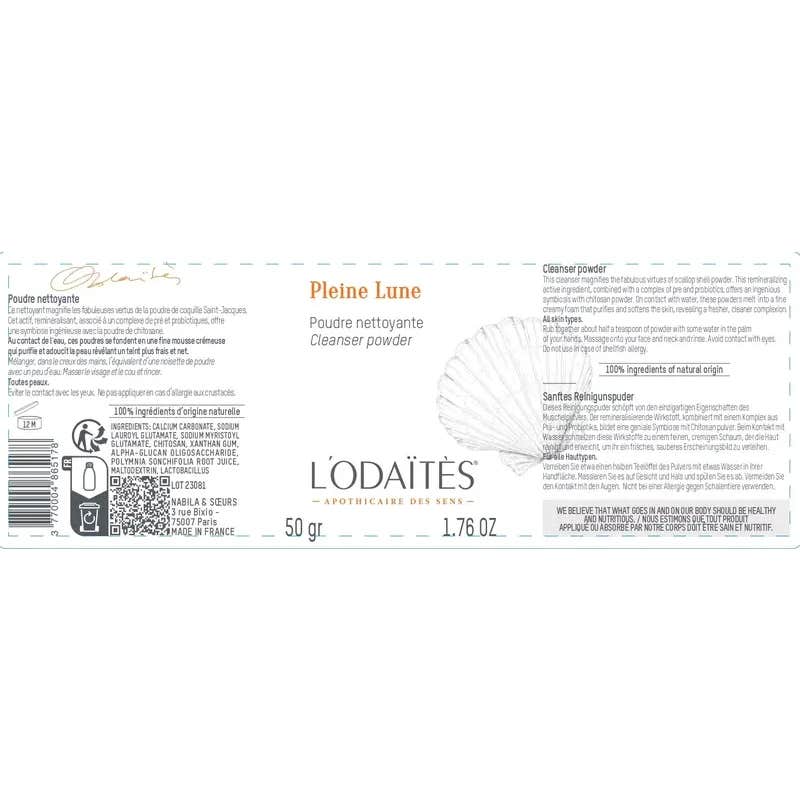 L'Odaïtès Pleine Lune Polvo Limpiador 50 gr es un innovador producto que destaca por sus propiedades renovadoras gracias al polvo de concha de vieira. Este componente activo, que actúa como remineralizante, se complementa con un complejo de prebióticos y probióticos, creando una eficaz combinación con el polvo de quitosano.