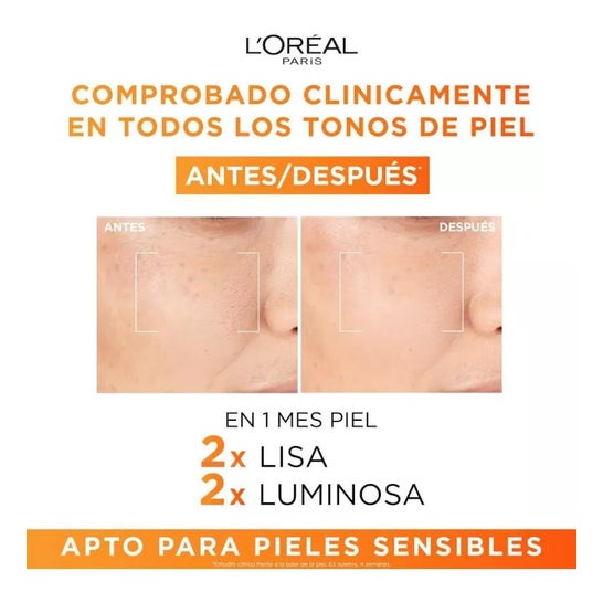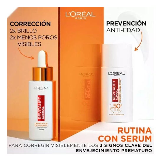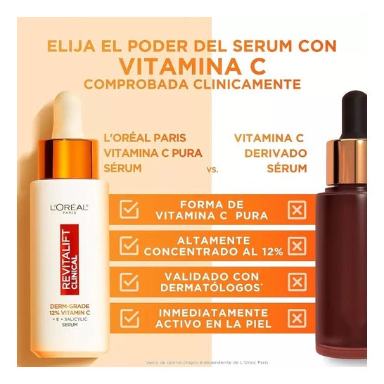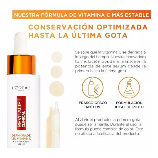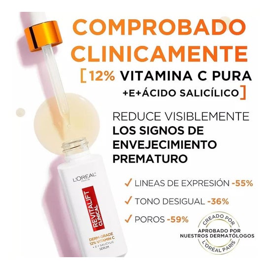 L'Oréal Revitalift Clinical Der-Grade 12% Vitamina C Sérum 30ml es un sérum de efecto antiedad que ayuda a reducir los signos de la edad, gracias a su formulación con vitamina C pura. Además, contiene ácido salicílico que ayuda a reducir los poros y alisar la piel y vitamina E que contribuye a proteger la piel del estrés oxidativo.