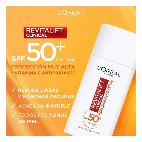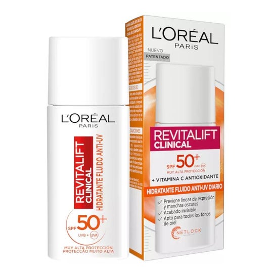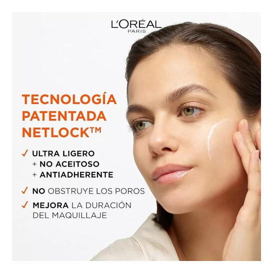 Crema muy fluida que ayuda a proteger la piel de las agresiones externas. Formulada con filtros de protección solar muy altos SPF50 y vitamina C, que favorecen el refuerzo de la protección antioxidante de la barrera cutánea. Además, contribuye a unificar el tono del rostro y a difuminar las manchas oscuras y/o líneas de expresión. Enriquecida con vitamina E y ácido hialurónico, que fomentan la hidratación de la epidermis. Cuenta con tecnología netlock que facilita una rápida absorción a prueba de agua, con un acabado invisible. Adecuada para todo tipo de pieles. Dermatológicamente probada.