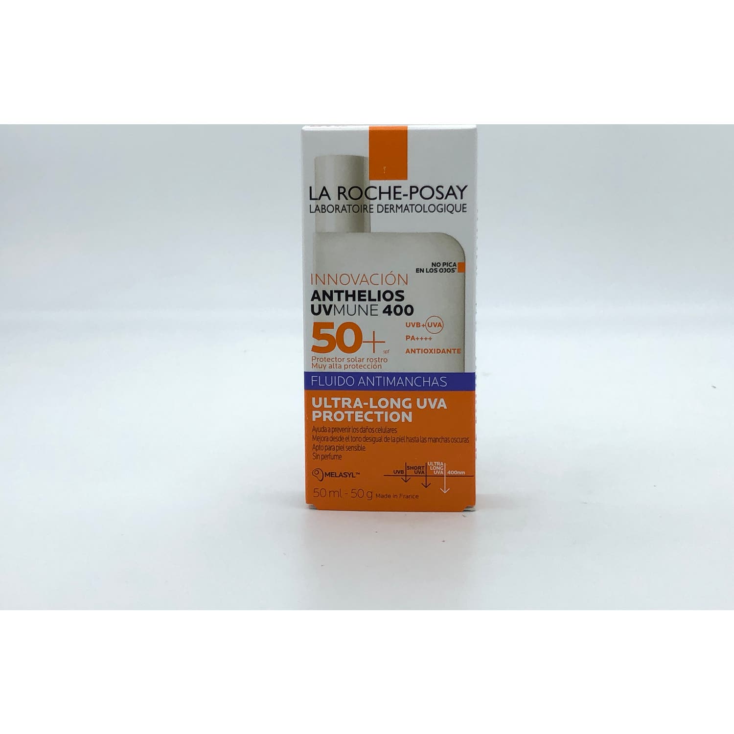 La Roche Posay Anthelios UVMune 400 Fluido Anti-Manchas SPF50+ 50ml es un fotoprotector solar fluido facial con acción antimanchas. Tiene una textura ligera y es invisible.