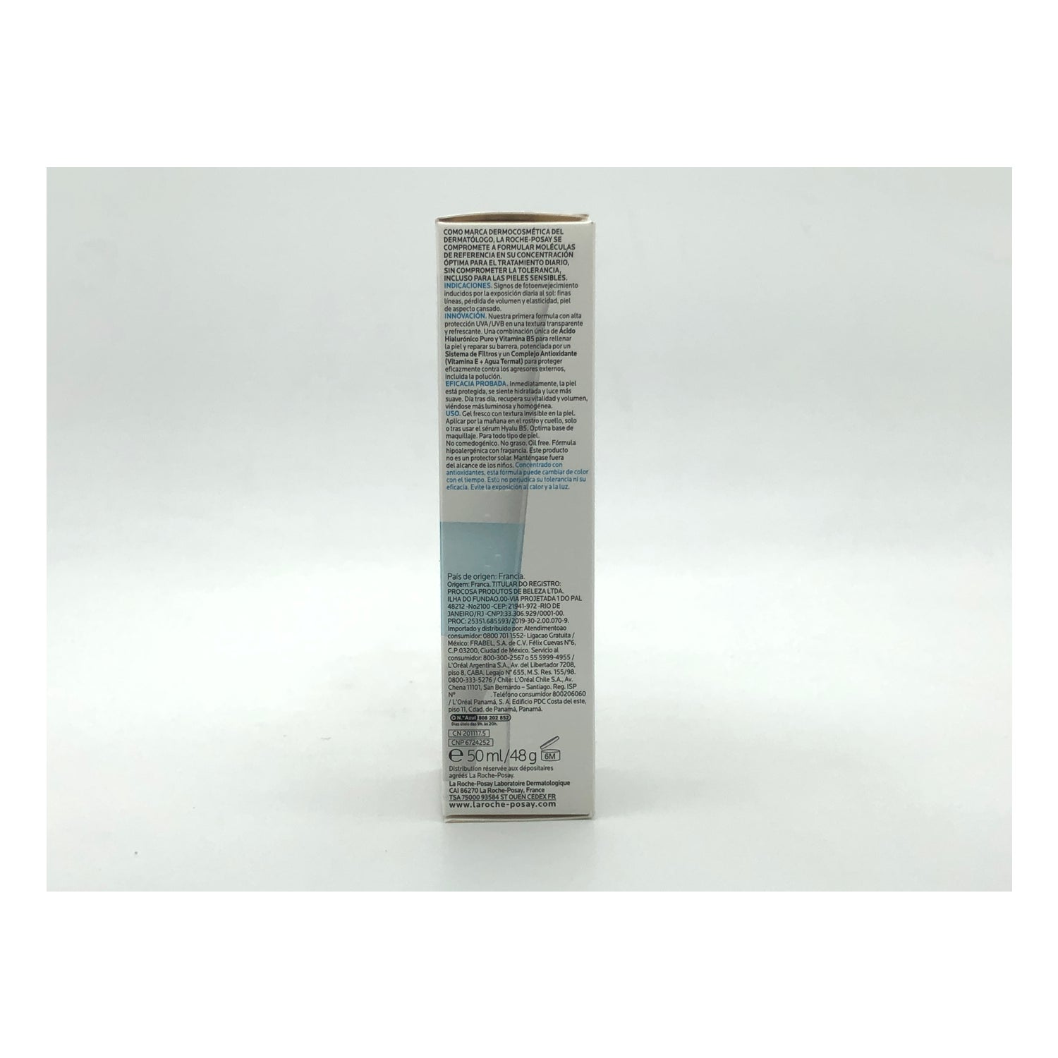 Su fórmula con ácido hialurónico, molécula antienvejecimiento de referencia, contribuye a hidratar y rellenar la piel. Contiene Vitamina B5 que ayuda a calmar y reparar la piel, además de proteger de las agresiones externas como son los rayos UVB Y UVA y las contaminaciones gracias a la vitamina E + agua termal de La Roche-Posay.