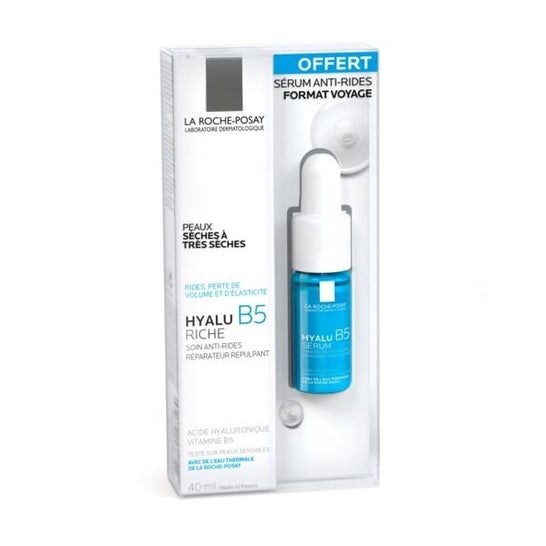 Pack de tratamiento antiarrugas. Contiene el tratamiento Hyalu B5, crema antiarrugas y el sérum. Indicado para mujeres, reafirmar, reparar y rellenar arrugas. El tratamiento antiarrugas proporciona hidratación y reparación gracias a los ácidos hialurónicos puros y vitamina B5 que luchan contra las arrugas, y el sérum proporciona un regeneración de la piel, revitaliza la piel cansada o con un tono apagado. Fabricados con agua termal de La Roche-Posay. Tratamiento apto para personas intolerantes al níquel.