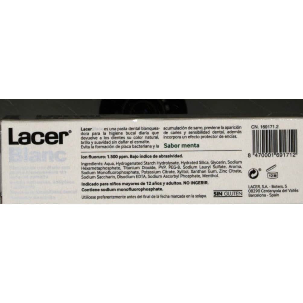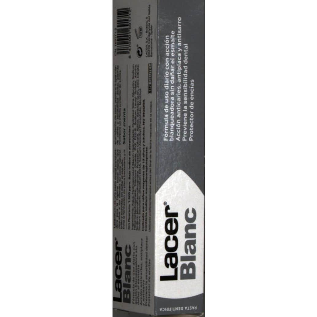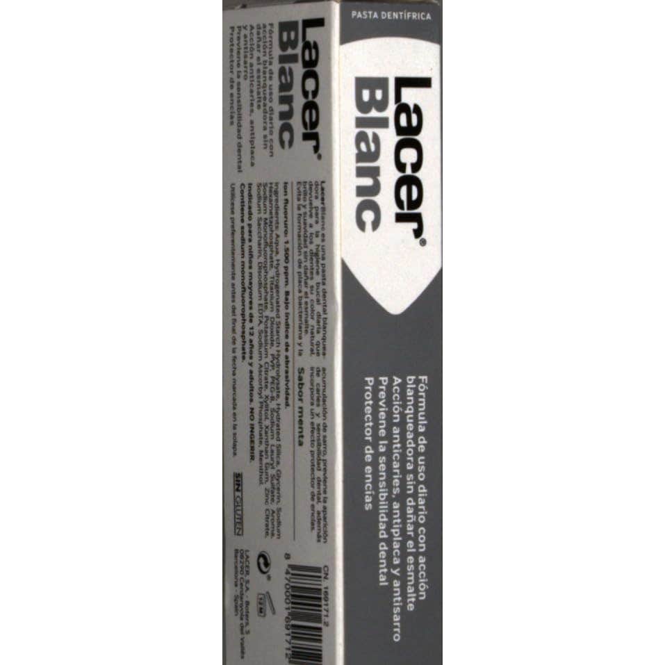 Lacer LacerBlanc Pasta Dentífrica Blanqueadora Menta 75ml es una pasta dental que ayuda a prevenir la formación de manchas de la superficie dental, y actúa sobre las manchas existentes, recuperando la uniformidad de color en los dientes.