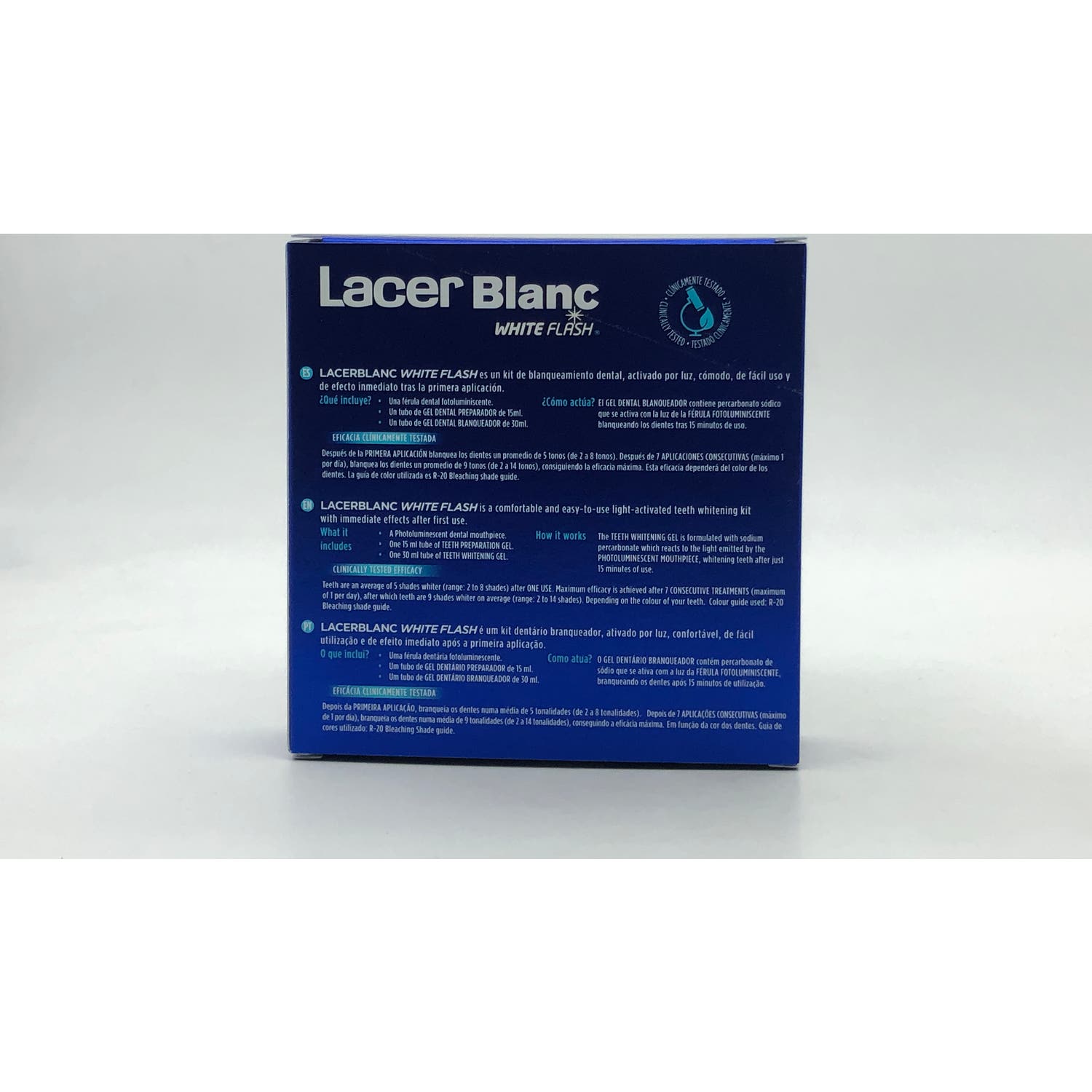 Lacer LacerBlanc White Flash Kit Dental Blanqueador es un producto que ayuda a blanquear los dientes. Activado por luz natural o artificial, ayuda a blanquear los dientes hasta 9 tonos y está ideado para empezar a dar sus primeros resultados a los 7 días de uso.